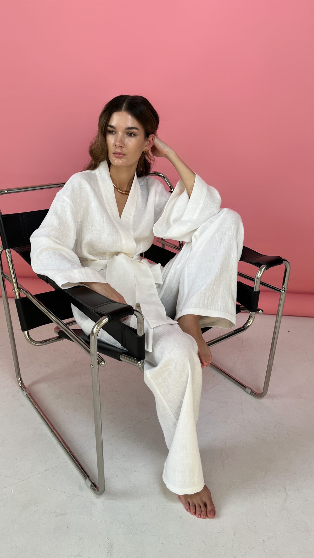 Женский брючный костюм из умягченного белого льна включает брюки прямого кроя и жакет в стиле кимоно.