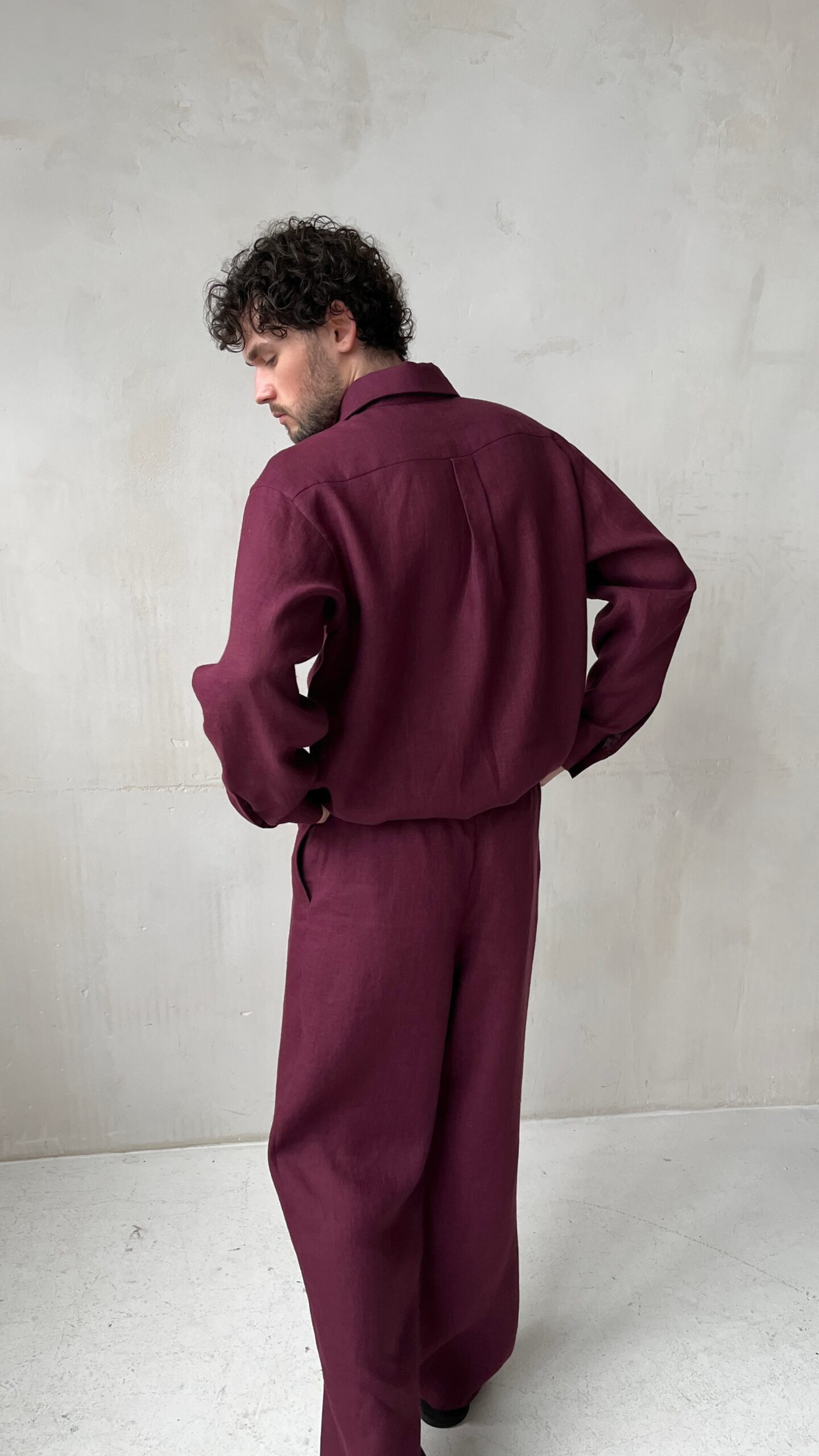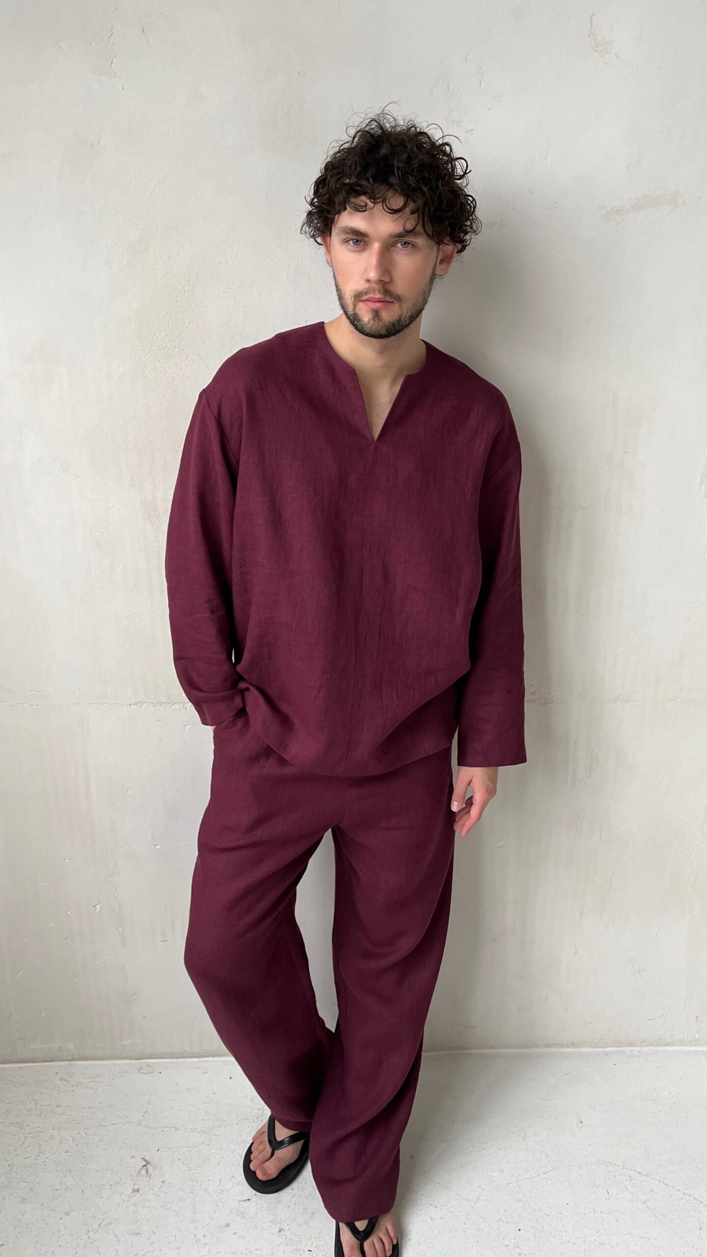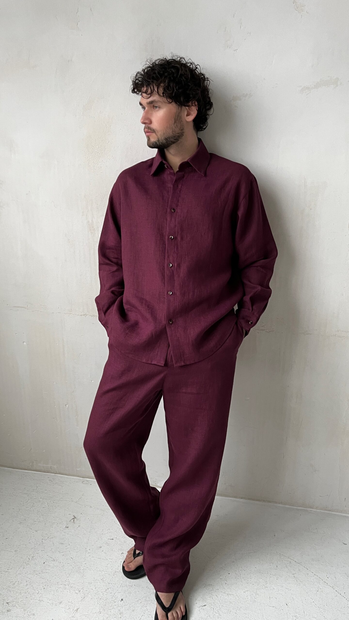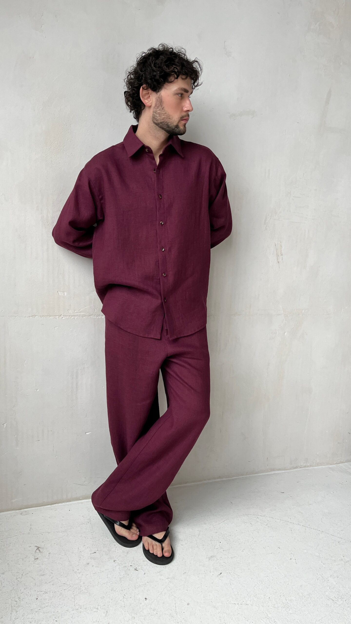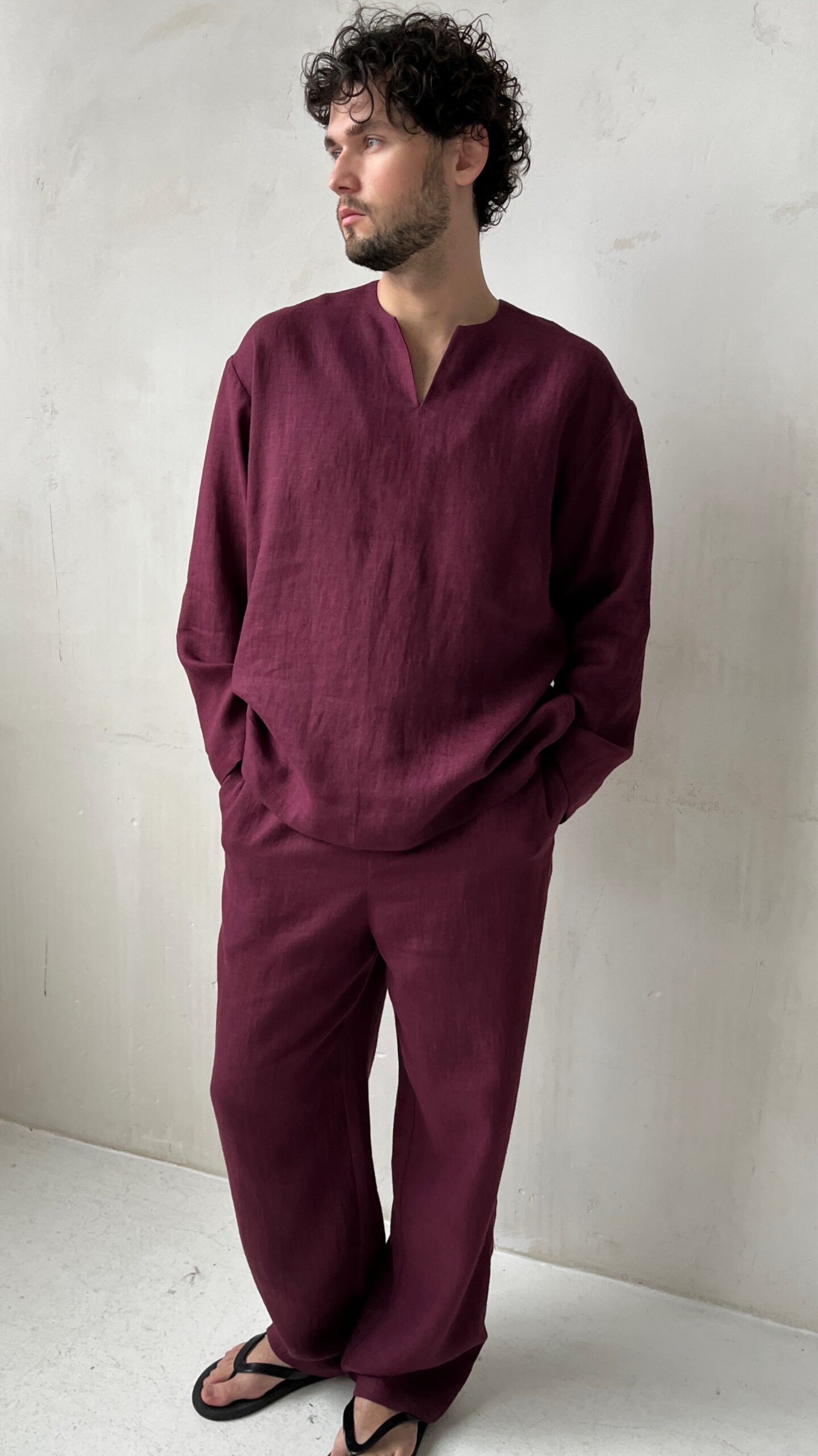 Мужские летние брюки винного цвета из умягченного льна. Прямой крой подчеркивает фигуру и обеспечивает свободу движений, а широкий пояс на эластичной резинке со шнурком гарантирует удобную посадку и комфорт при носке. Два боковых кармана делают модель функциональной, не нарушая лаконичности силуэта.