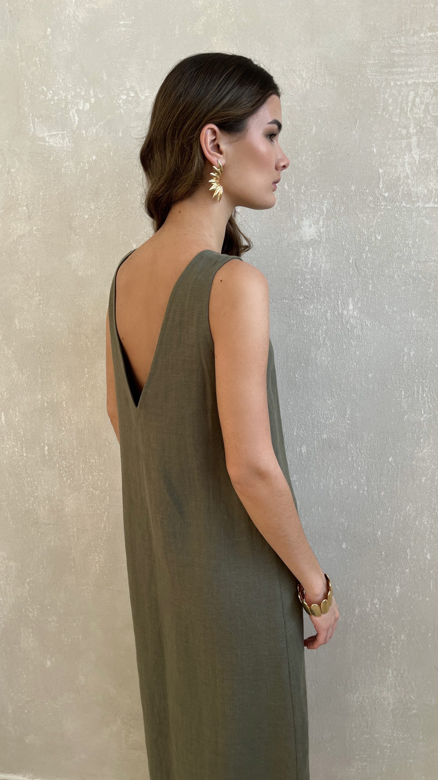 Длинное платье свободного кроя с глубоким разрезом спереди. V-образный вырез на груди и глубокий соблазнительный вырез по спинке. Платье изготовлено из костюмного, белорусского умягченного 100% льна с эффектом помятости — креш. Данная модель подойдет в качестве эффектной домашней сорочки, либо легкого платья на жаркую погоду.