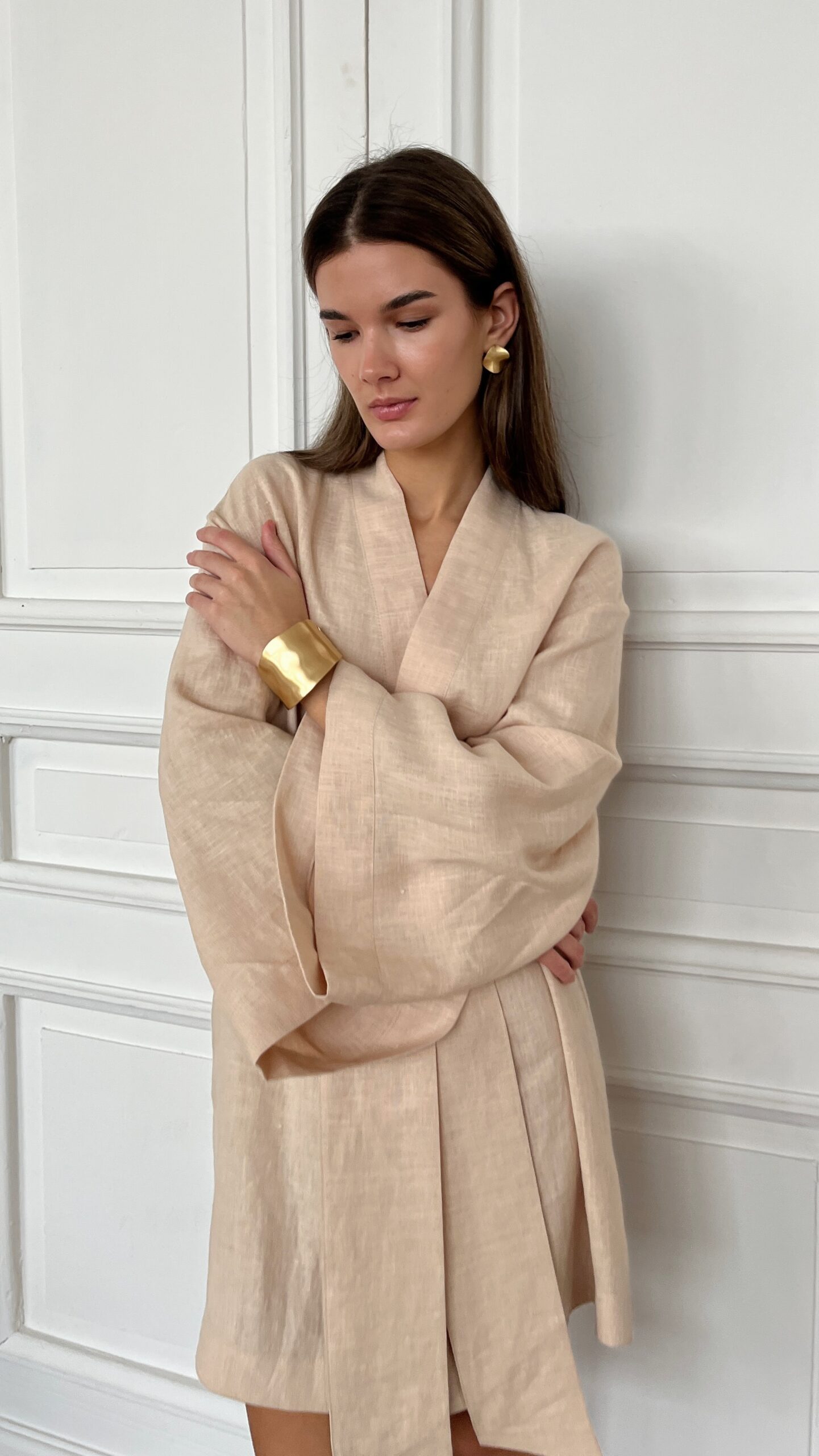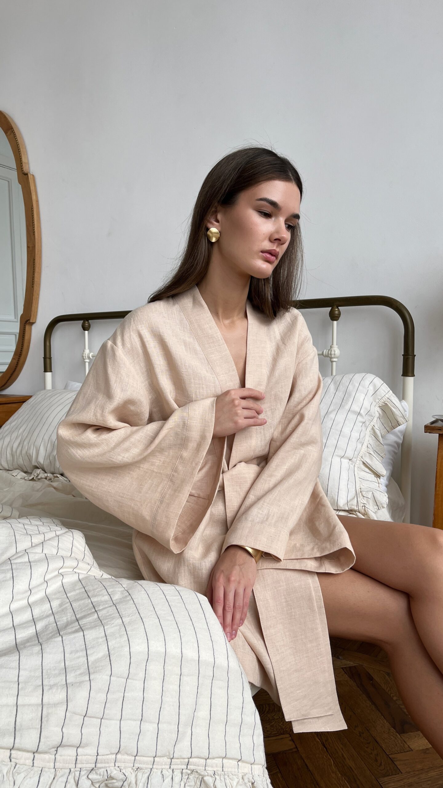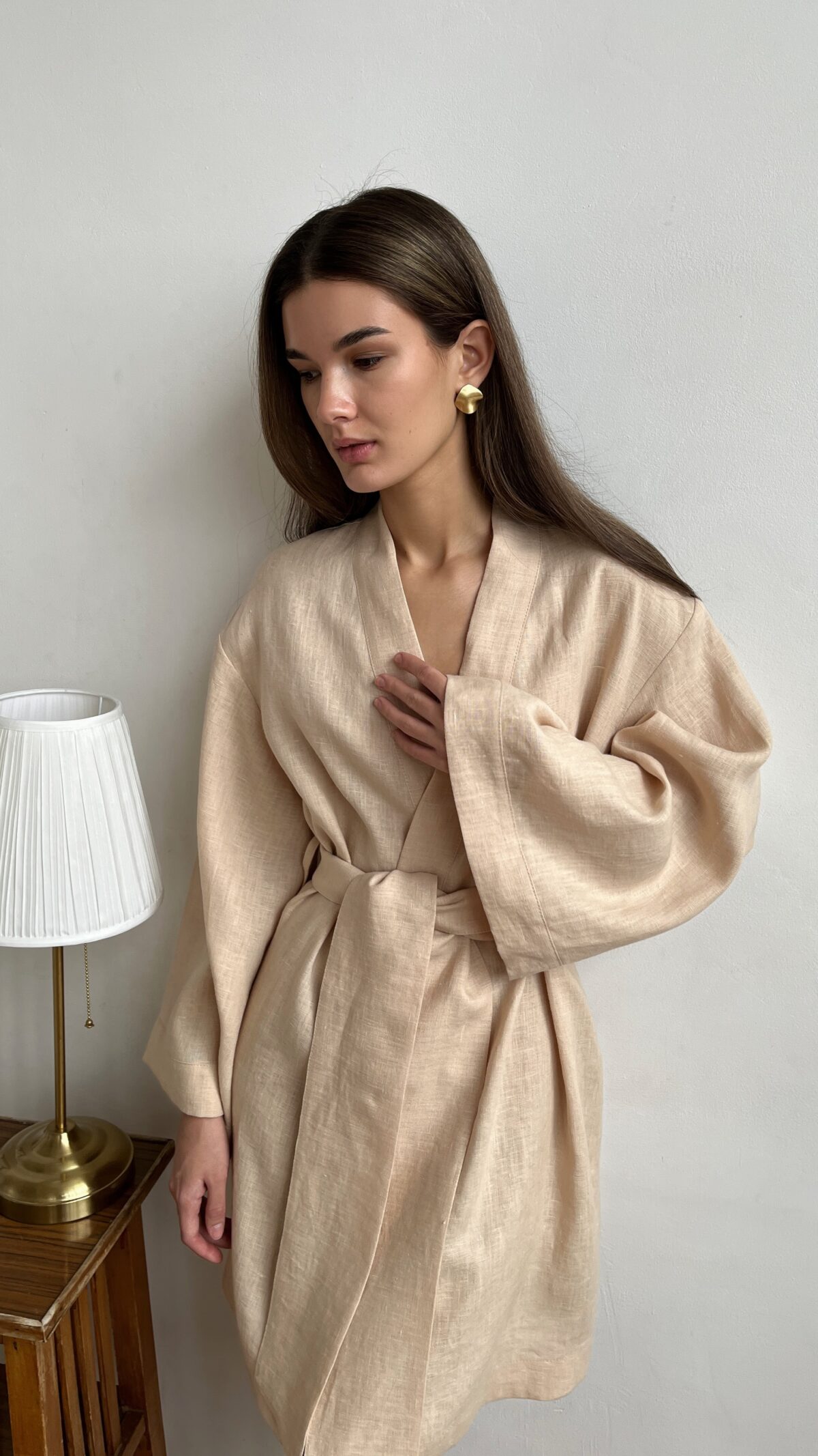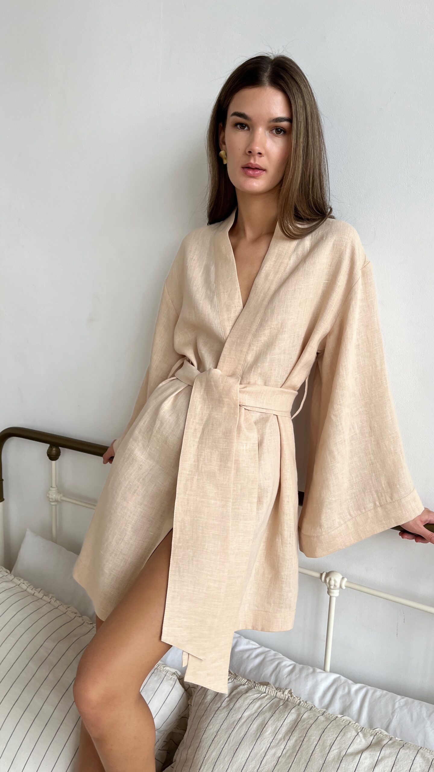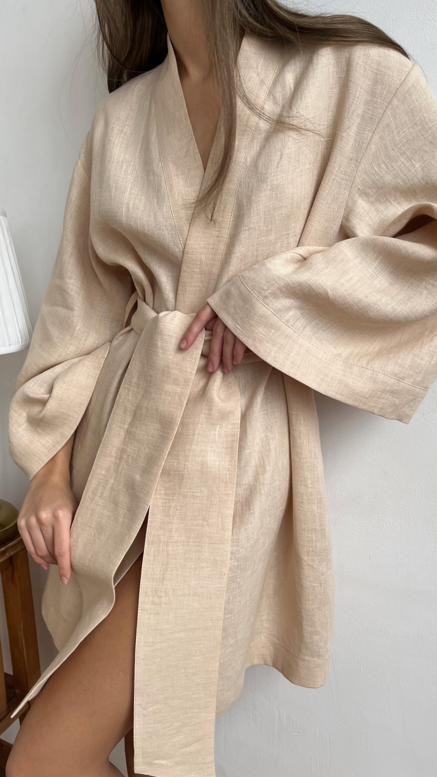 Короткий женский кимоно-халат из мягкого льна — универсальная вещь для дома, отдыха и утренних ритуалов. Спущенная плечевая линия и расслабленный силуэт обеспечивают свободу движений, а укороченная длина придает образу легкость и женственность.