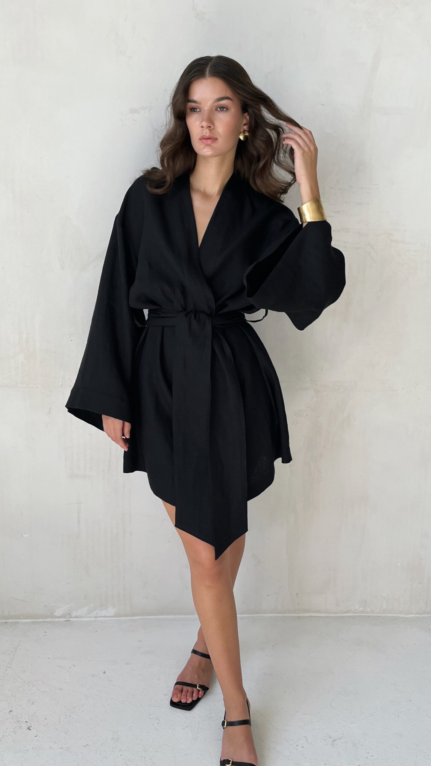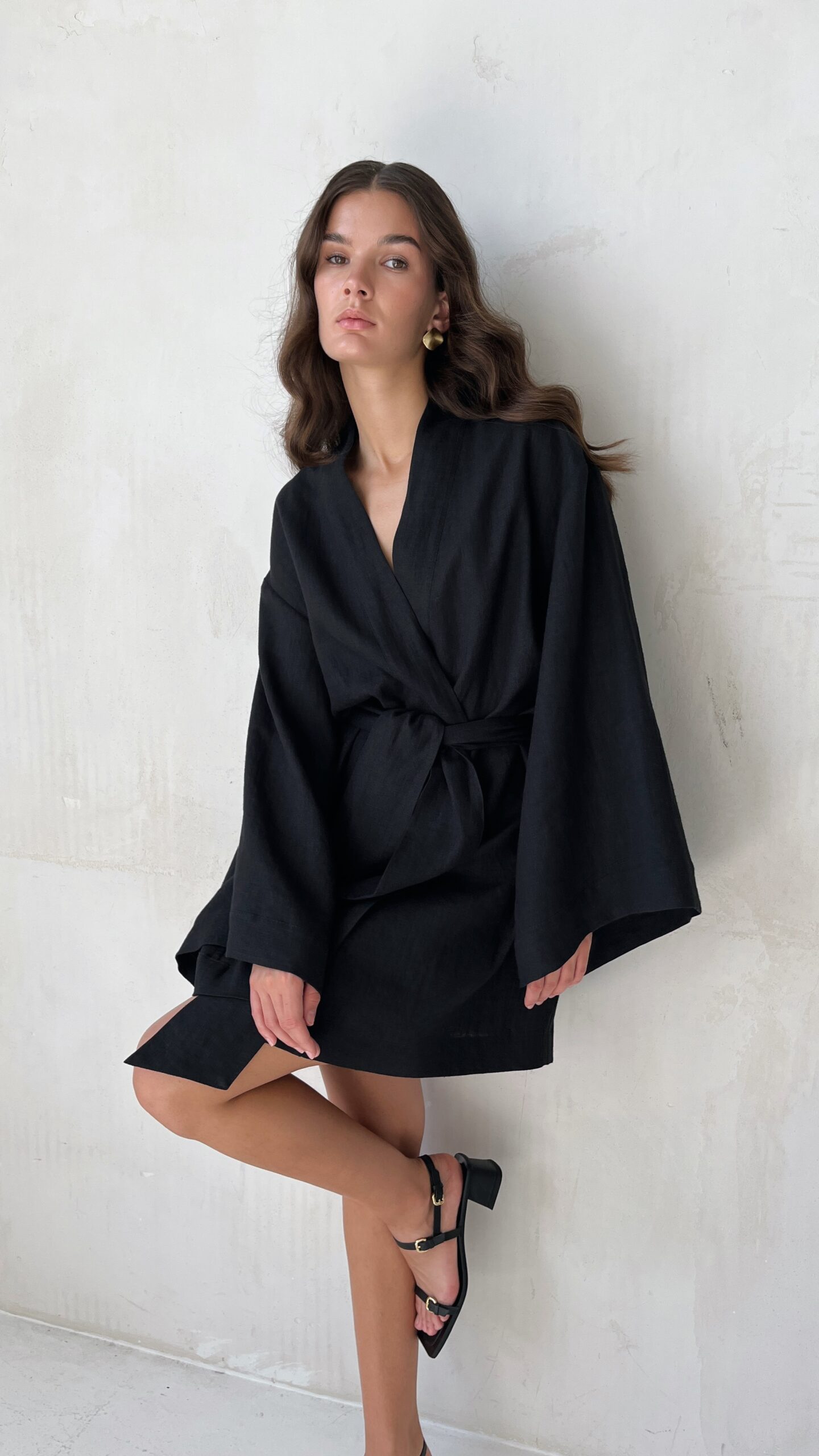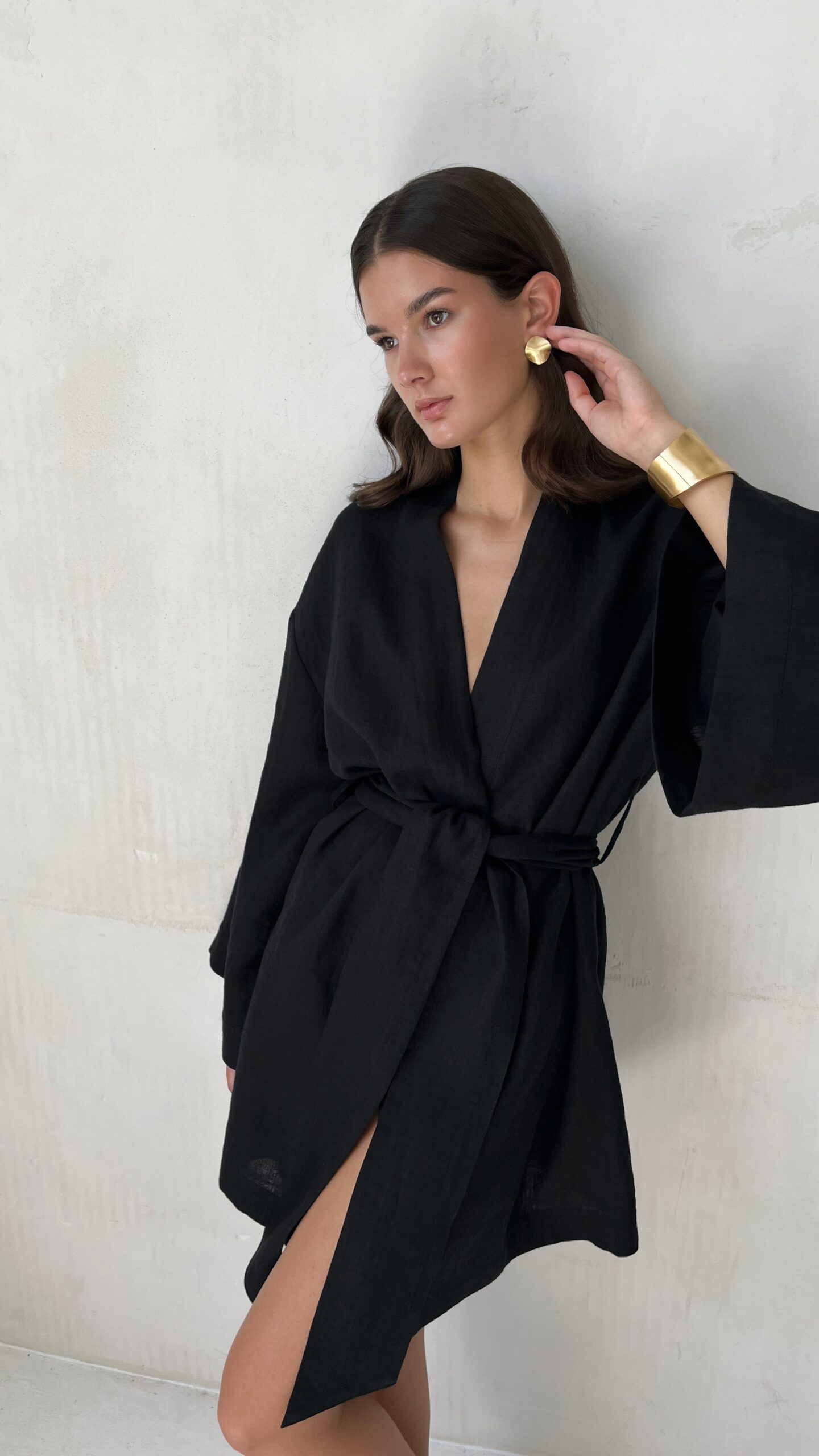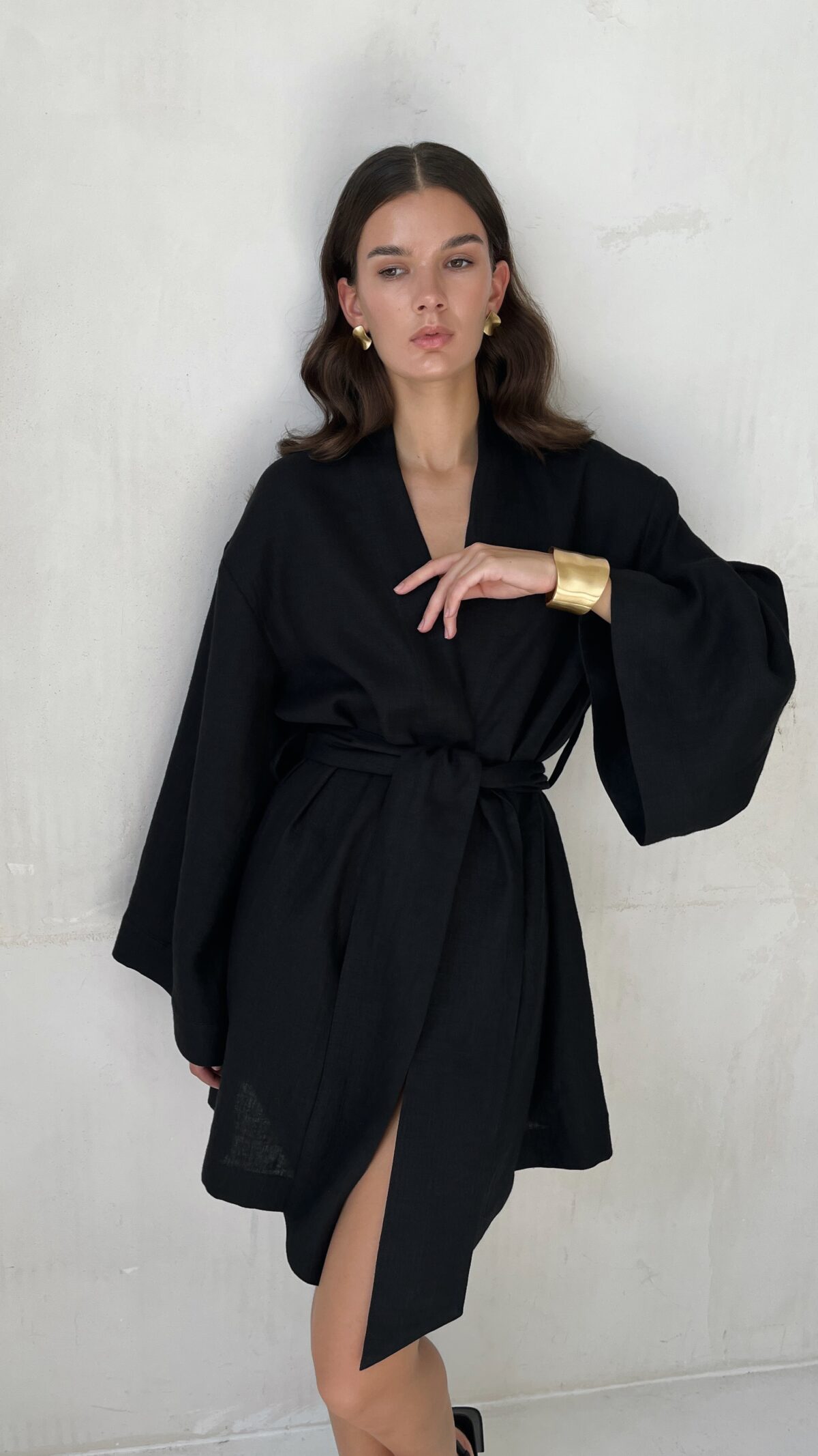 Кимоно свободного кроя с отдельным широким поясом в комплекте. Спущенная линия плеча и расклешенный рукав с ассиметричным краем. Изготовлено из костюмного, умягченного льна с crush эффектом. Кимоно можно носить самостоятельно, как платье, или как жакет в дополнение к другой одежде. Лаконичный крой позволяет носить его как в городских образах, на вечернюю прогулку, так и на отдыхе, а также дома, как красивый халат.