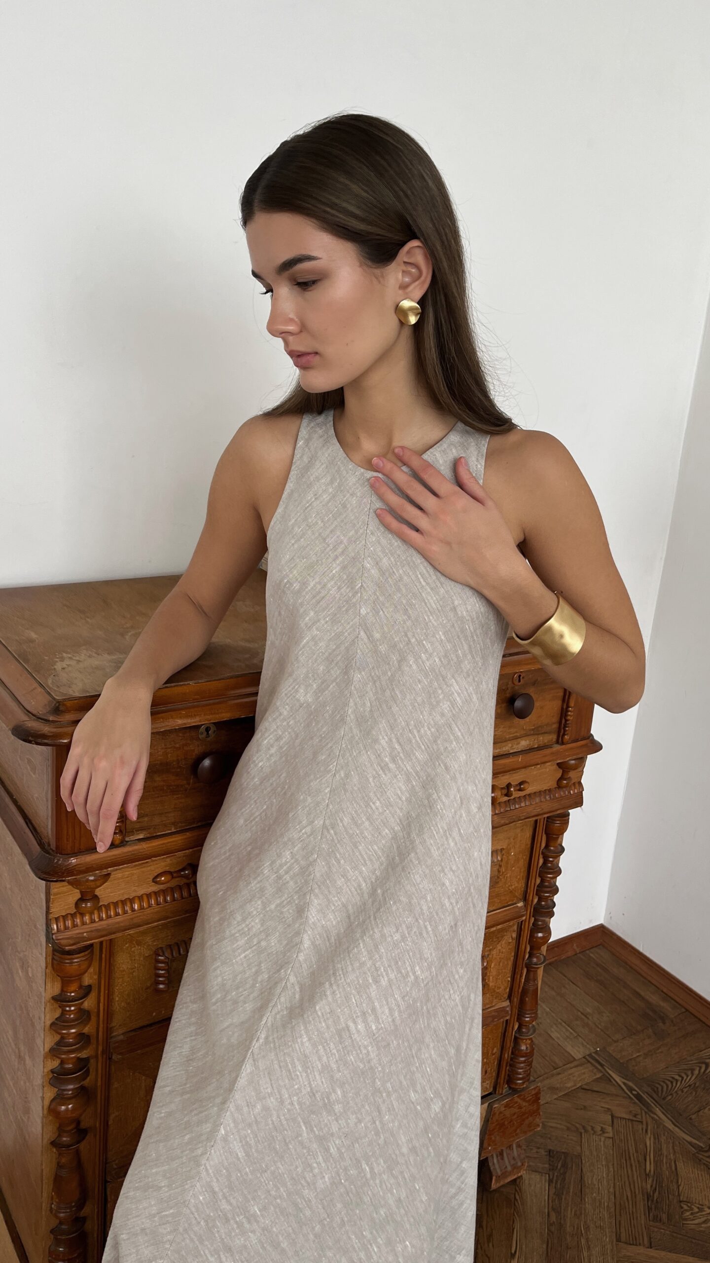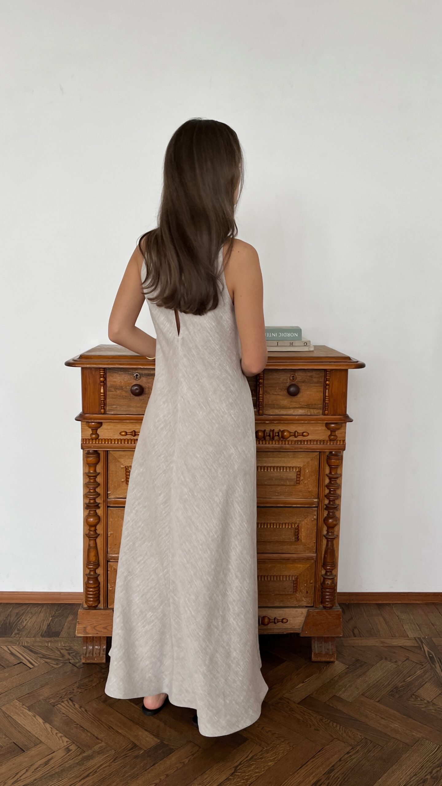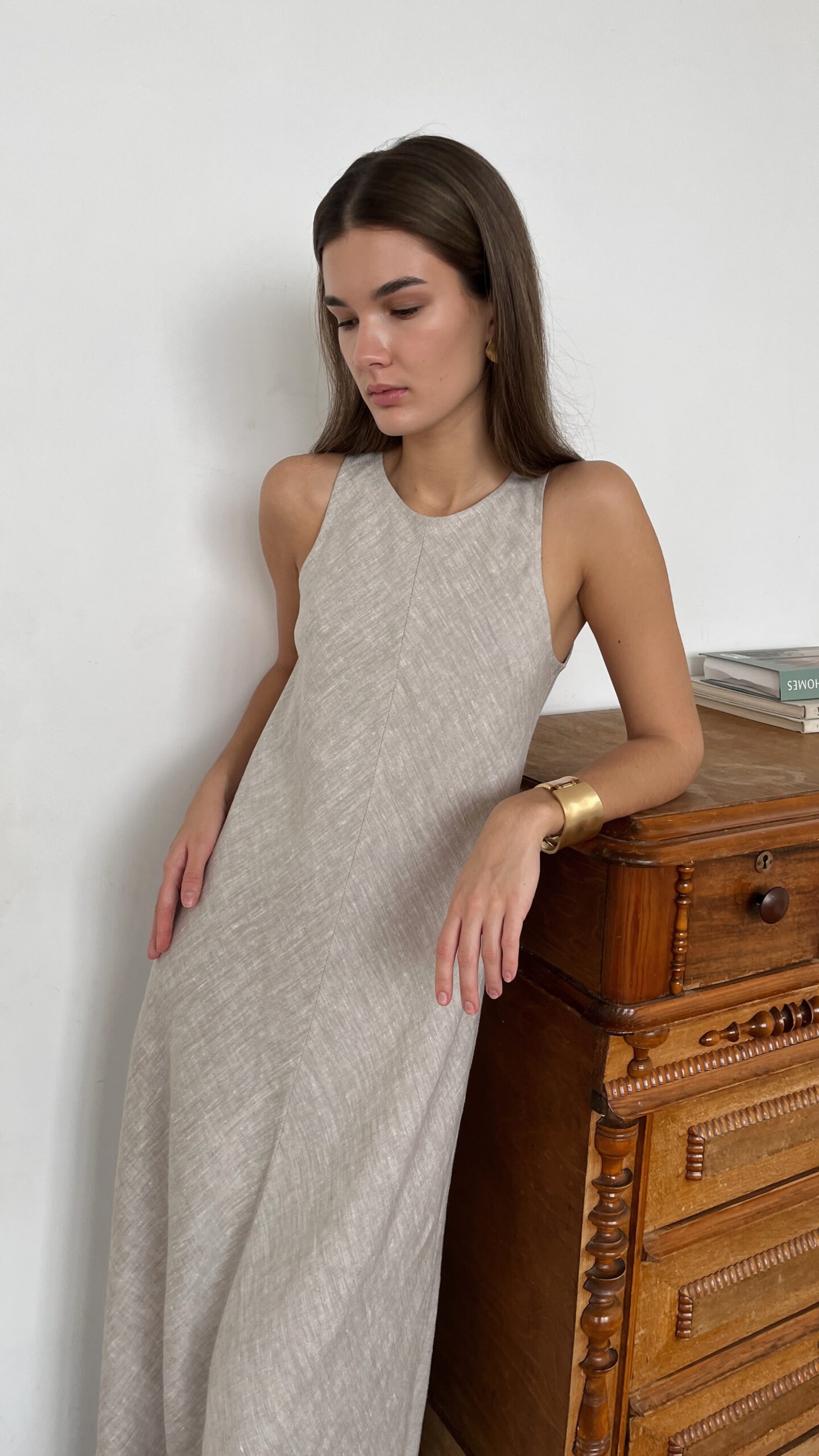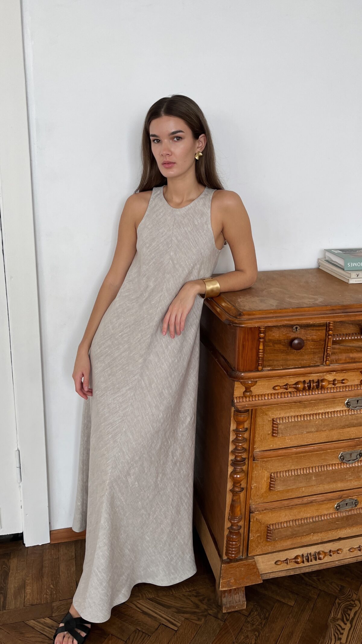 Платье макси с американской проймой из умягченного льна натурального оттенка. Крой по косой создает красивое струящееся движение ткани и позволяет платью изящно облегать фигуру, подчеркивая силуэт без утяжеления.