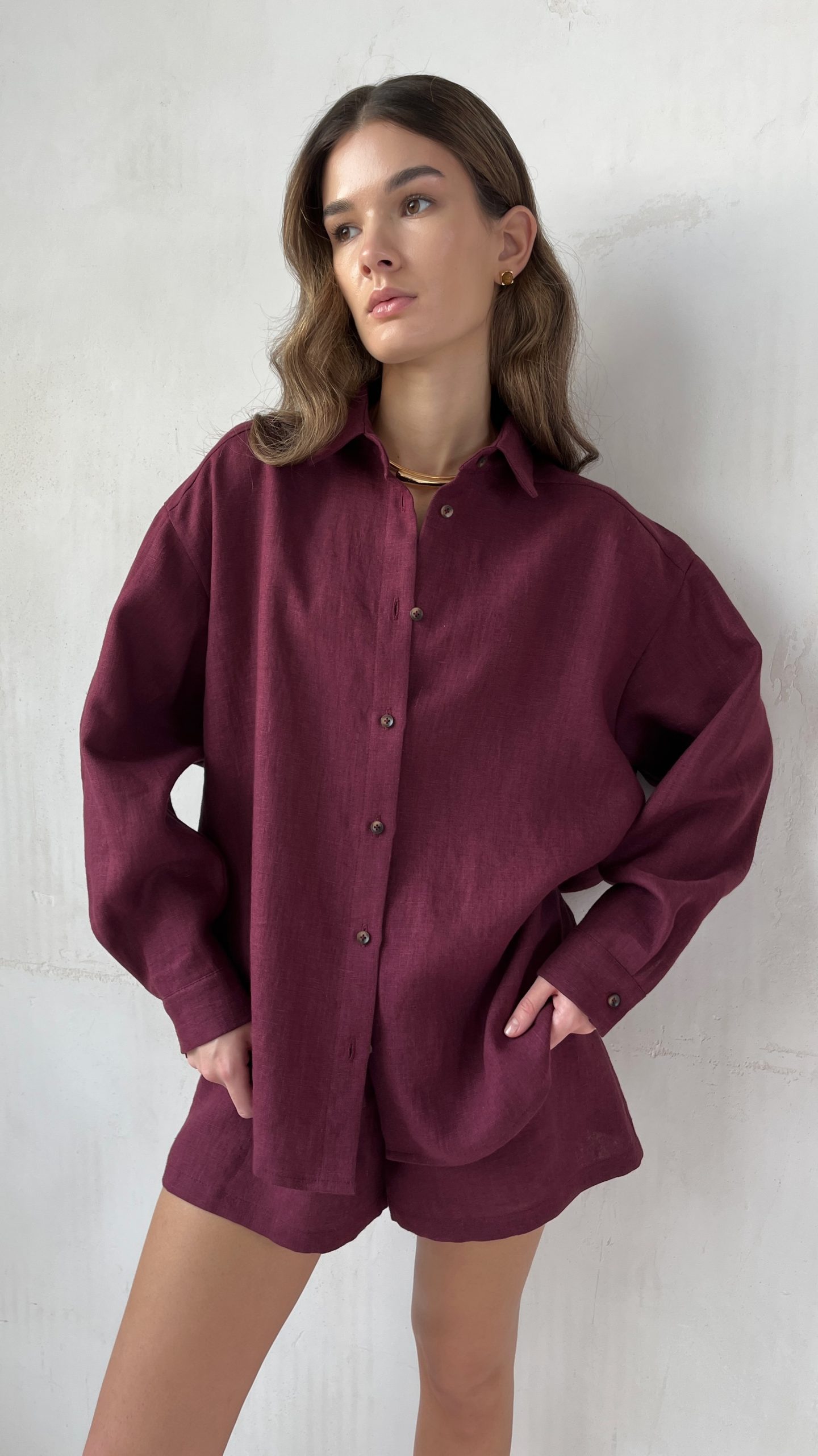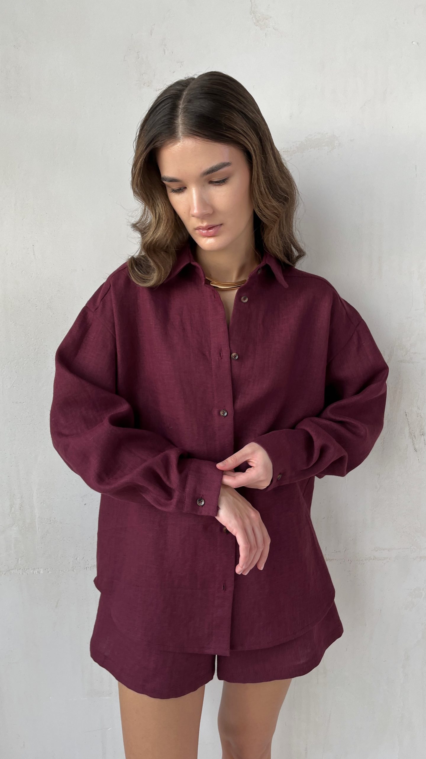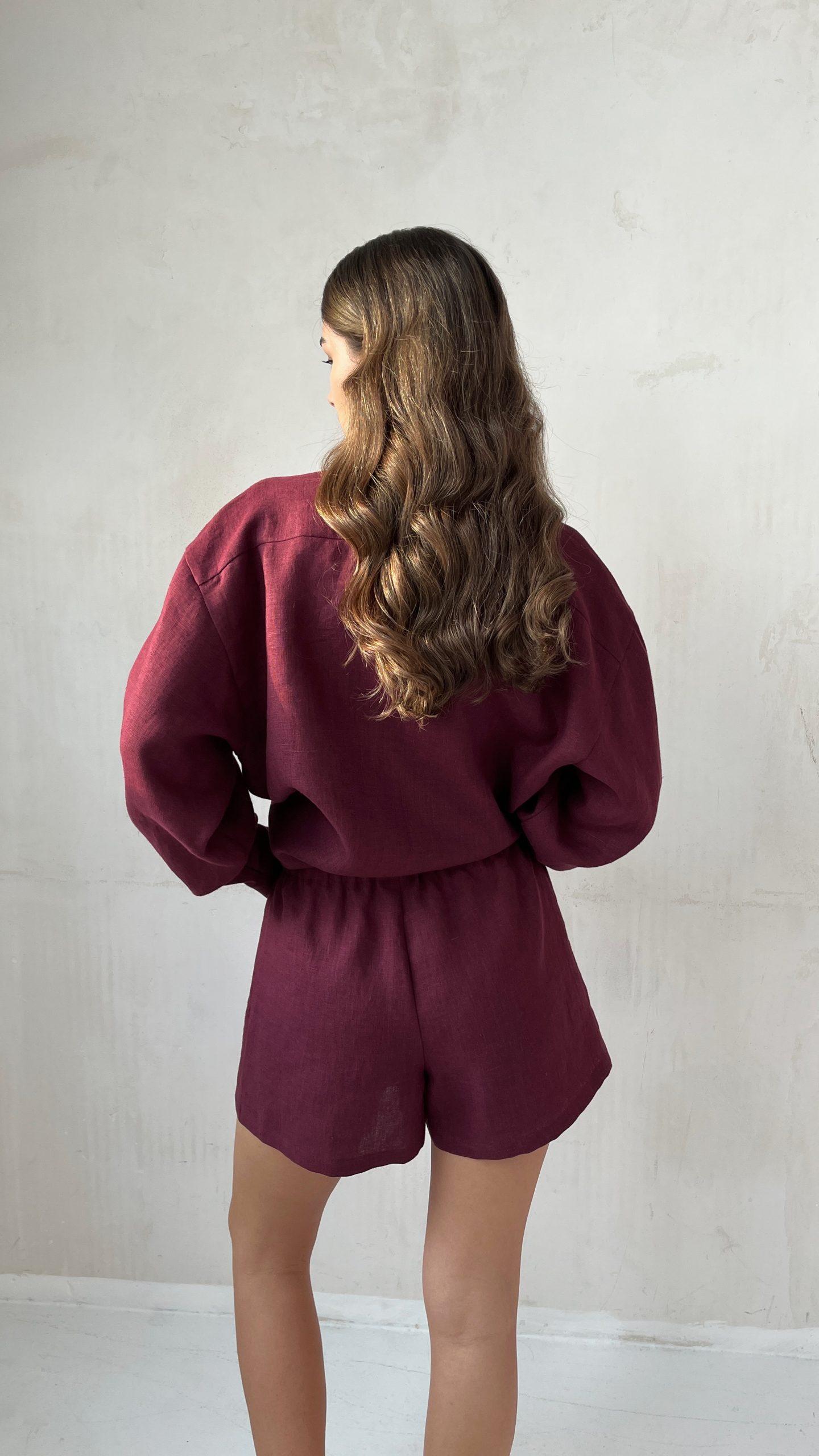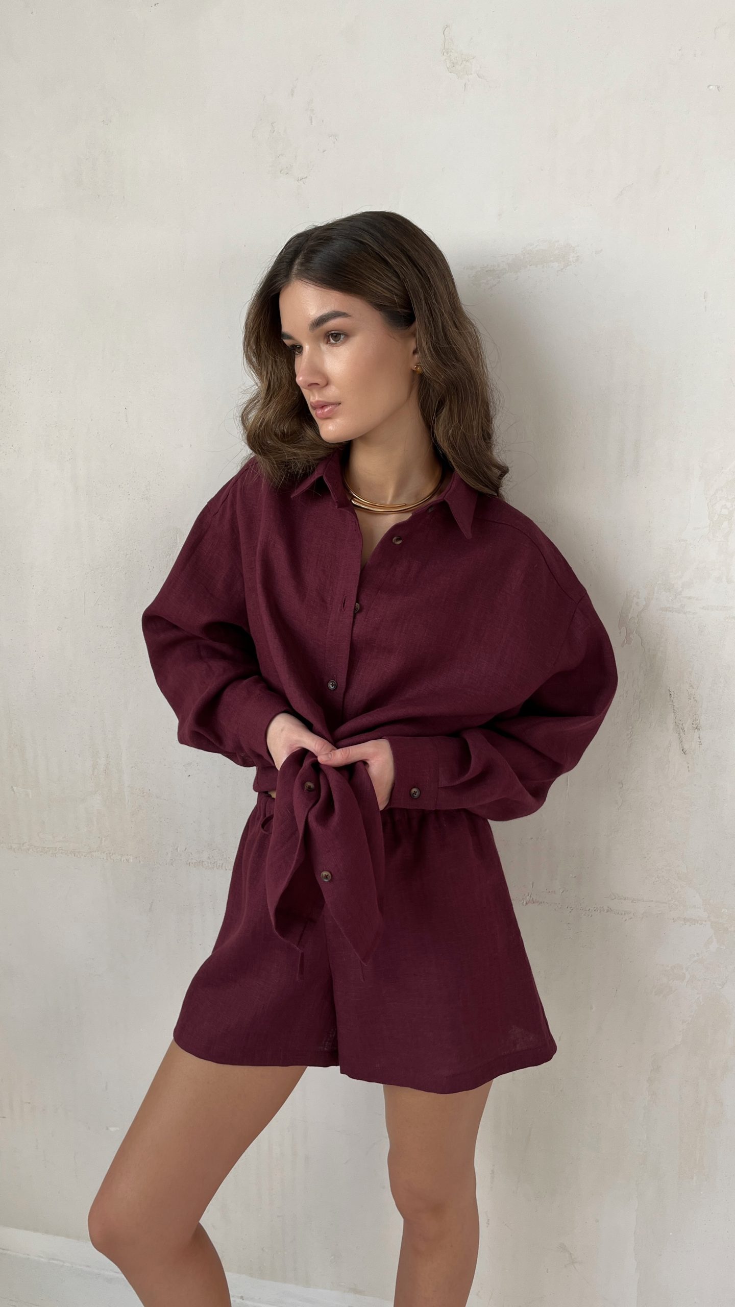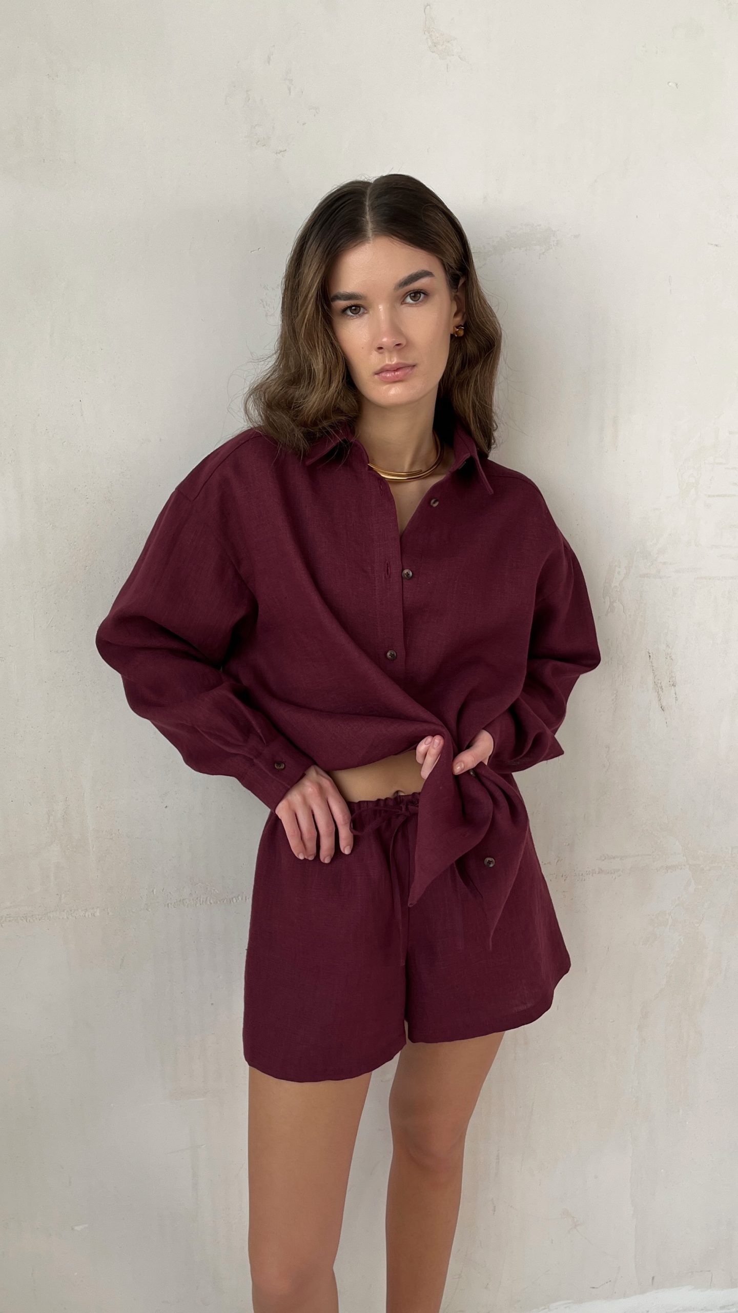 Летний льняной костюм с шортами и рубашкой из умягченного льна в благородном бордовом оттенке. Рубашка свободного кроя с длинным рукавом и спущенной линией плеча, кокетка сзади и скругленный нижний край. Короткие шорты на эластичном поясе дополнены шнурком для более комфортной посадки в талии.