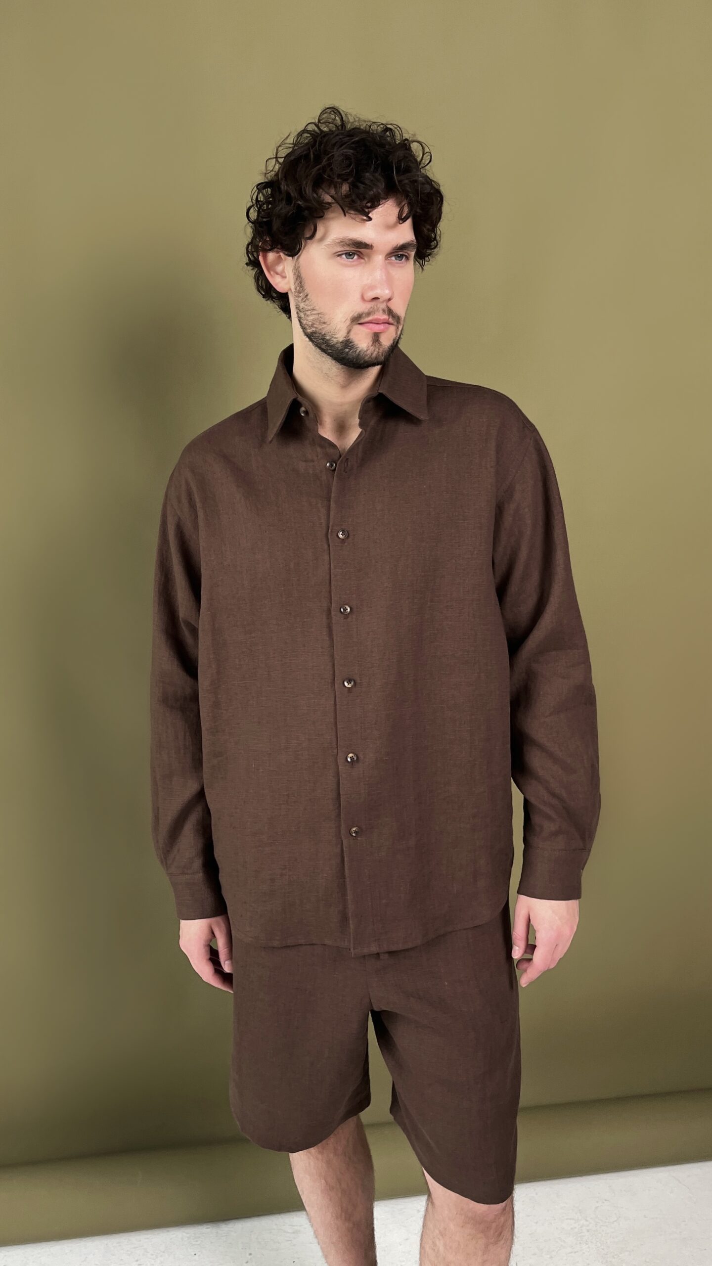 Мужская льняная рубашка с длинным рукавом в благородном коричневом оттенке. Оверсайз крой обеспечивает свободную посадку и непринужденный силуэт, а умягченный лен приятен к телу уже с первой носки.