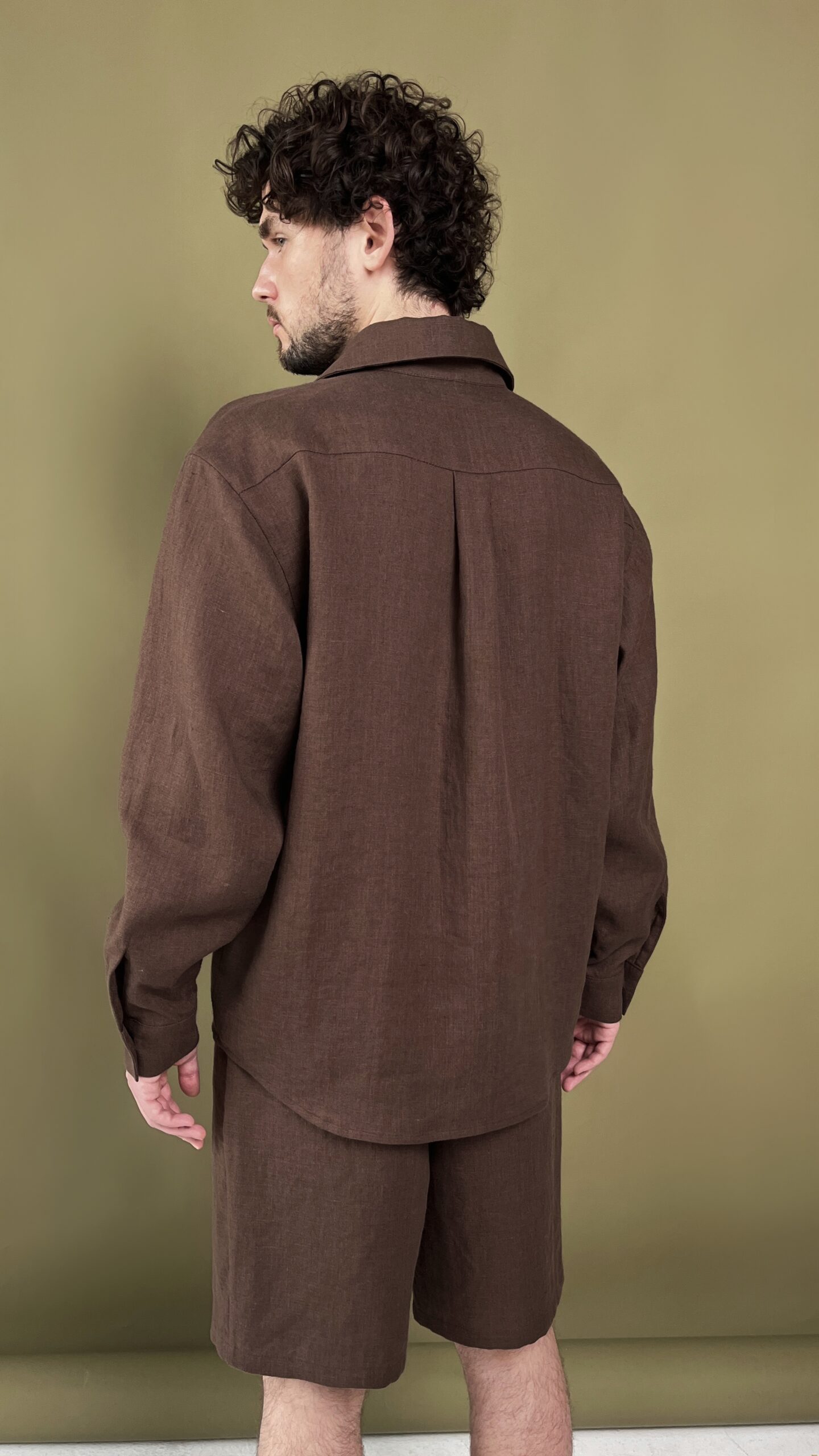 Мужская льняная рубашка с длинным рукавом оверсайз кроя в коричневом цвете.