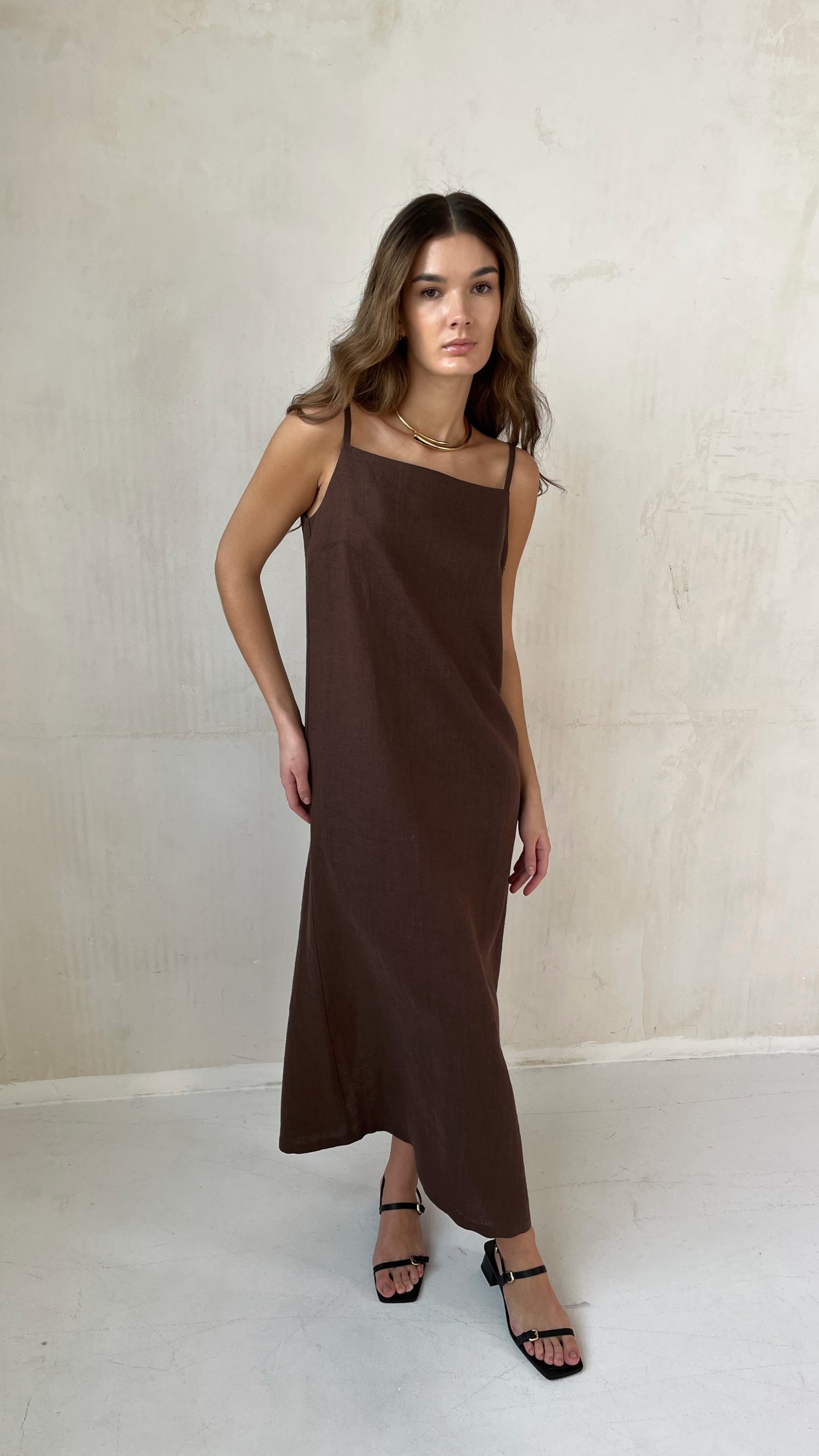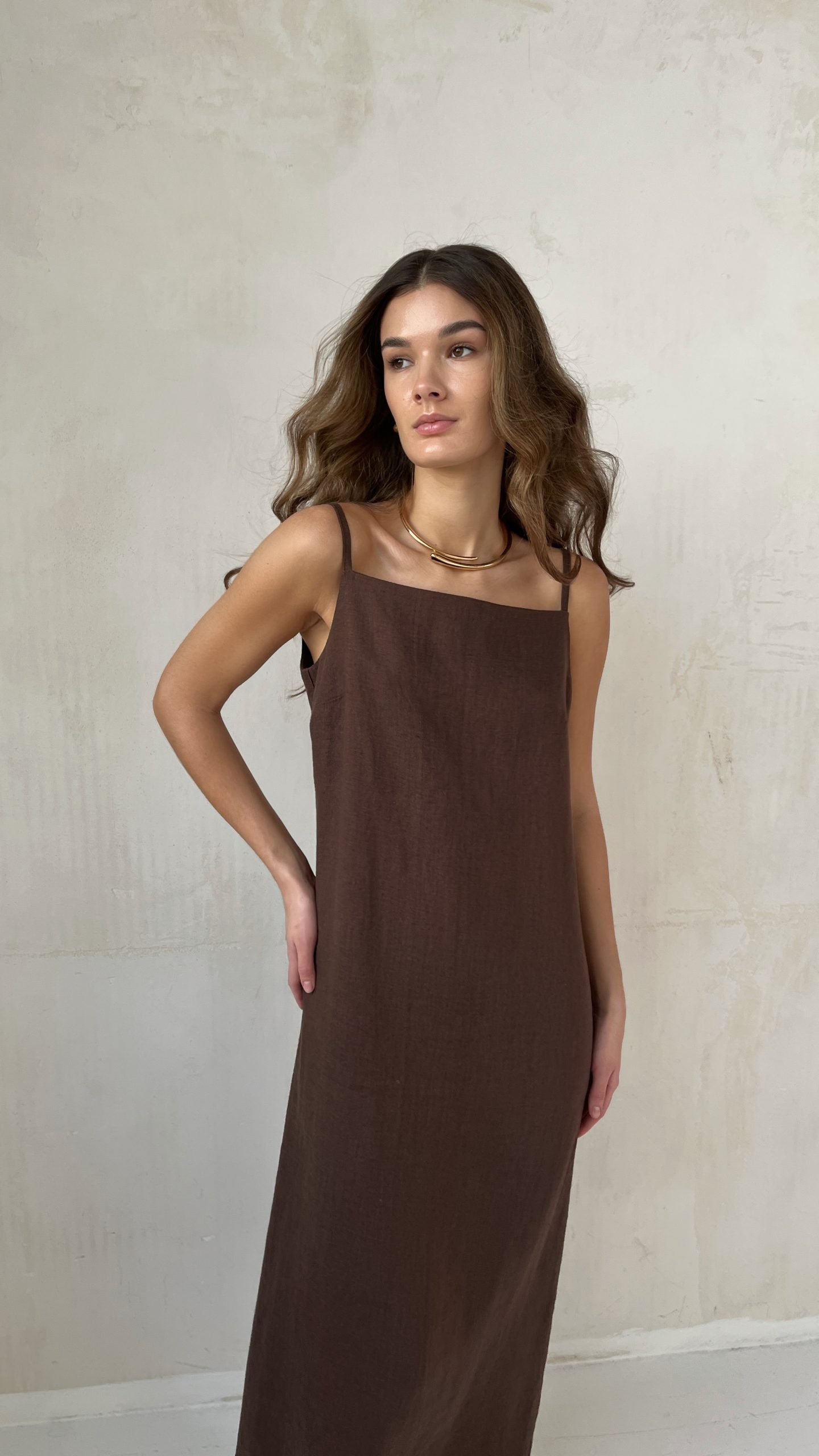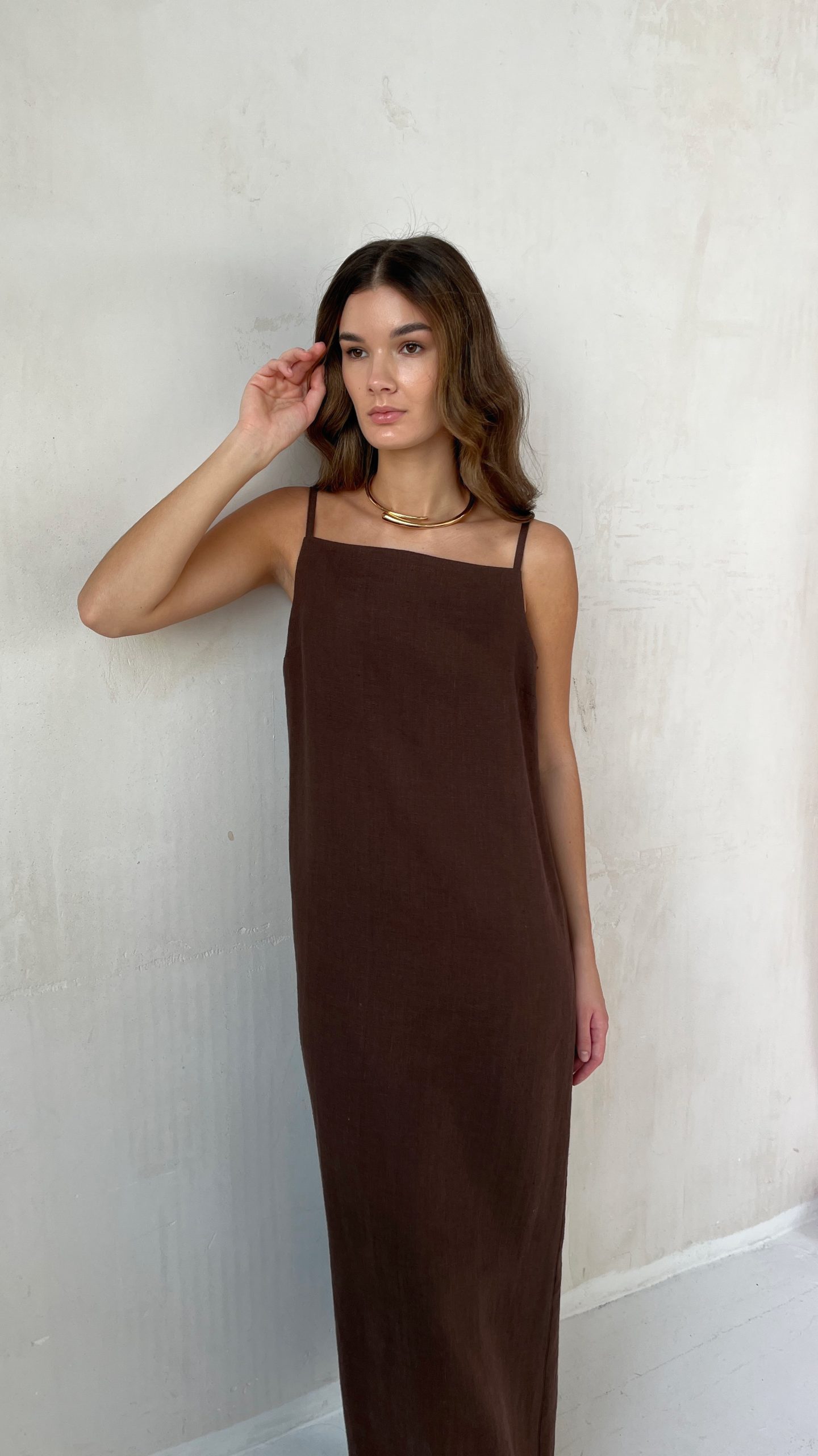 Льняное летнее платье на регулируемых бретелях в шоколадном оттенке. Модель свободного кроя в длине макси, которая элегантно скрывает силуэт. Утонченный разрез сзади добавляет изысканности образу и обеспечивает свободу движений.