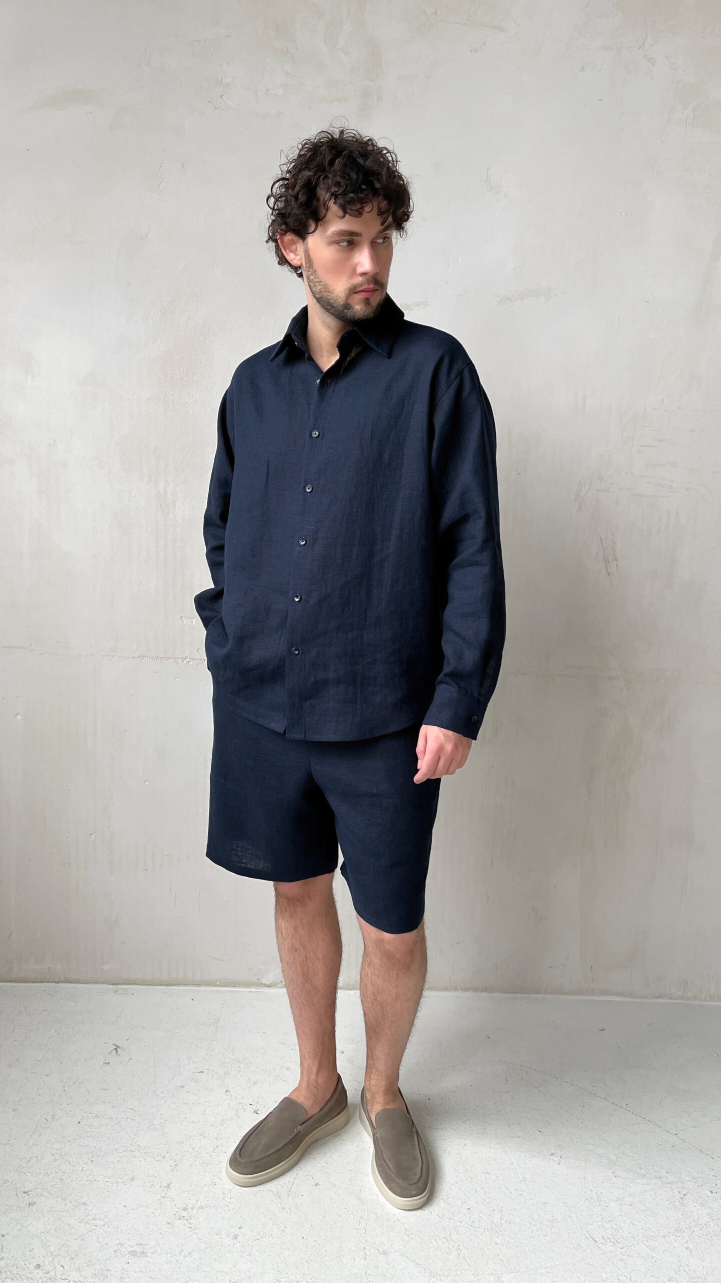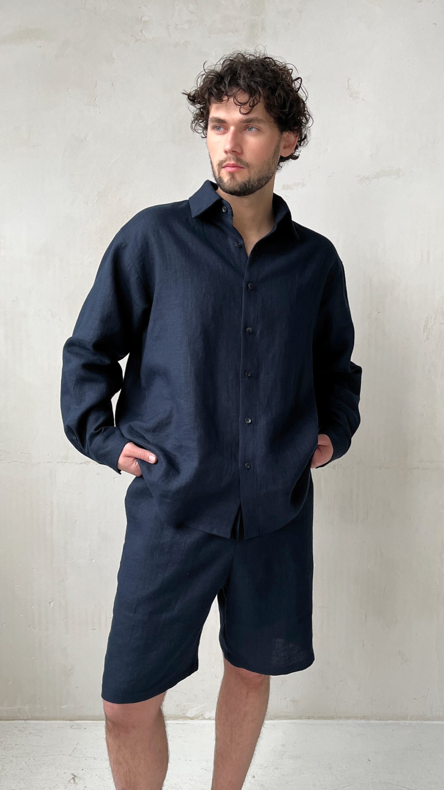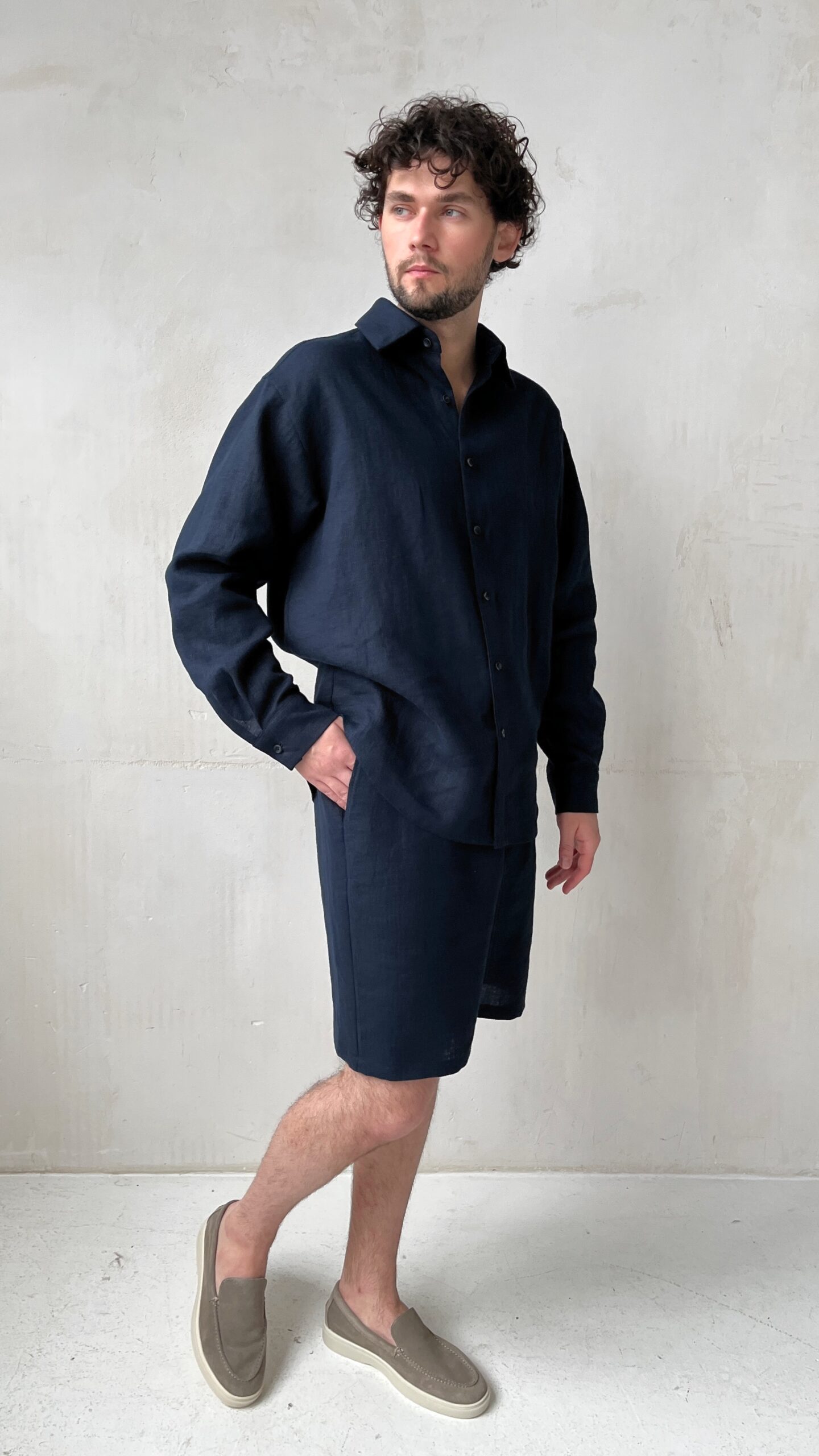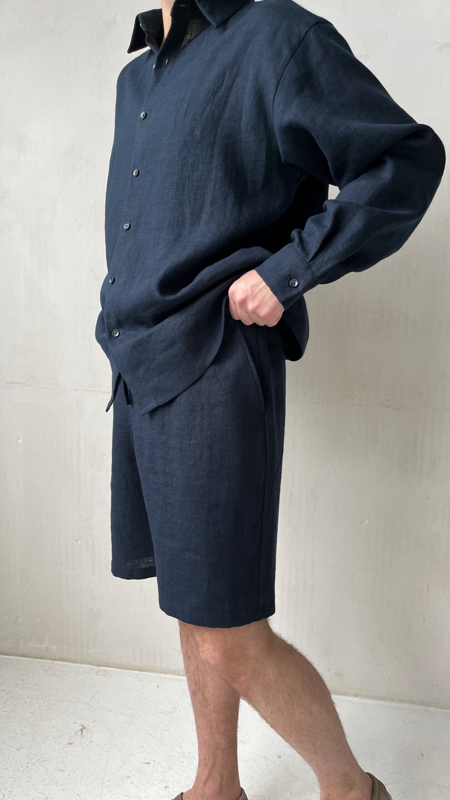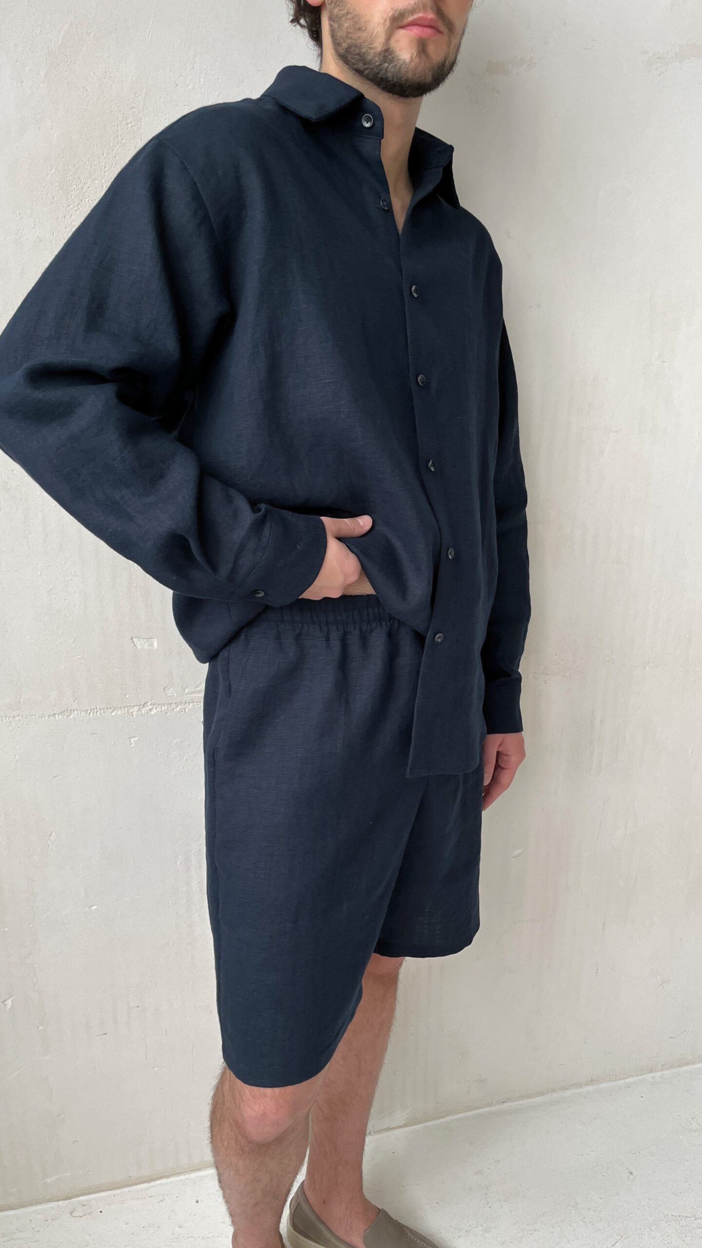 Мужские удлиненные шорты бермуды из премиального льна в глубоком чернильно-синем цвете. Модель, элегантно заканчивающаяся чуть выше колен, воплощает в себе идеальный баланс между формальным стилем и летней непринужденностью.