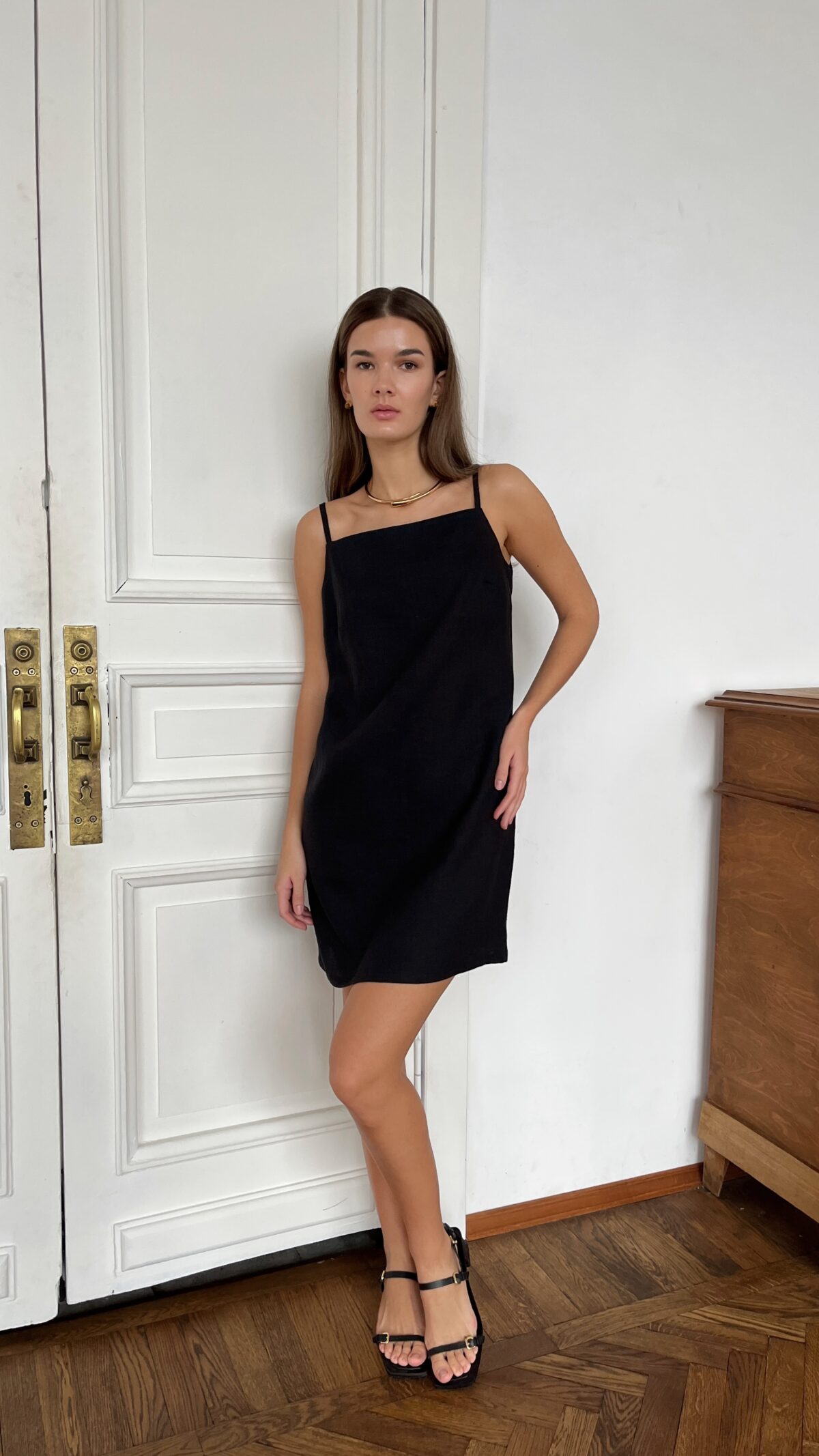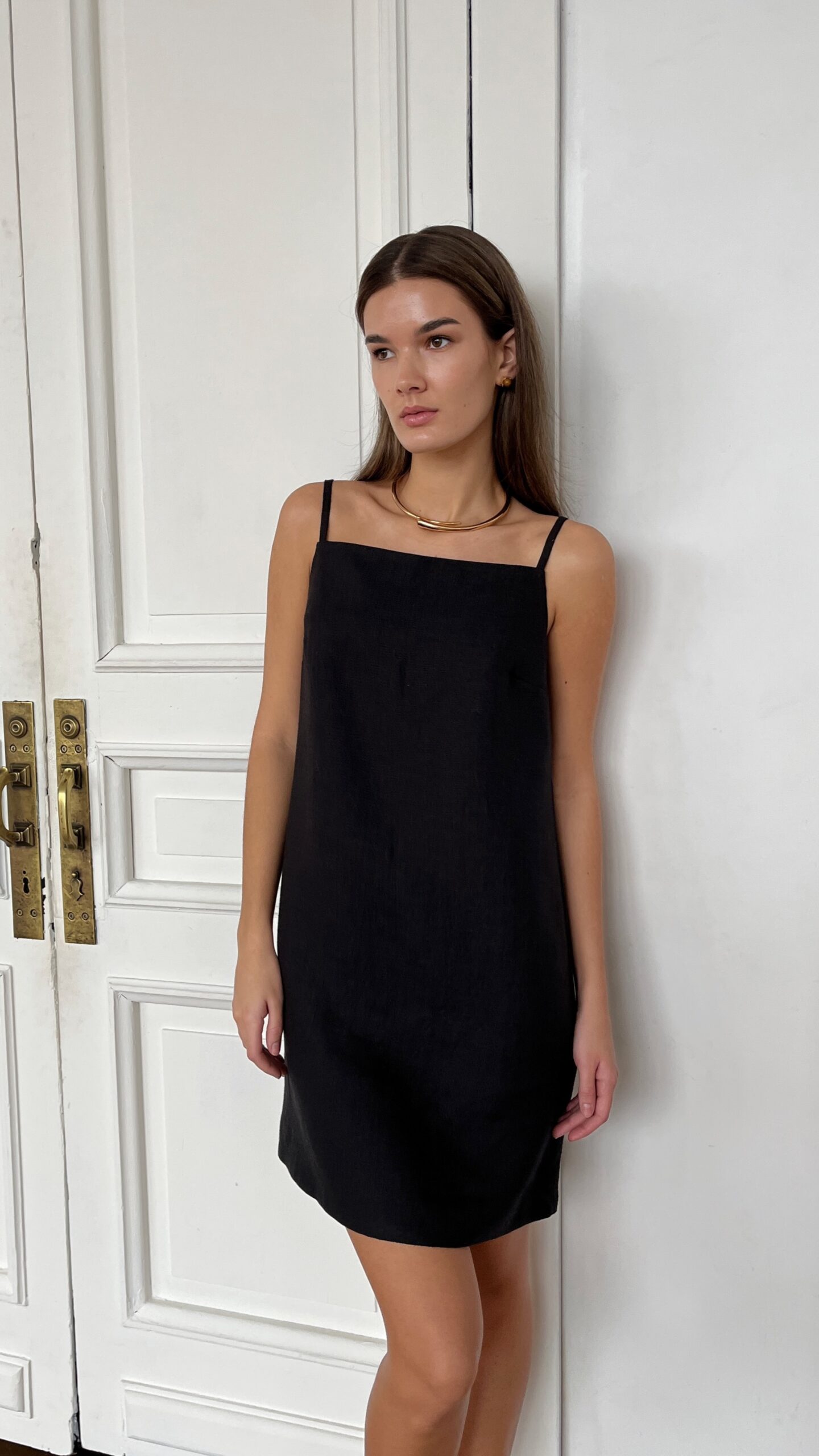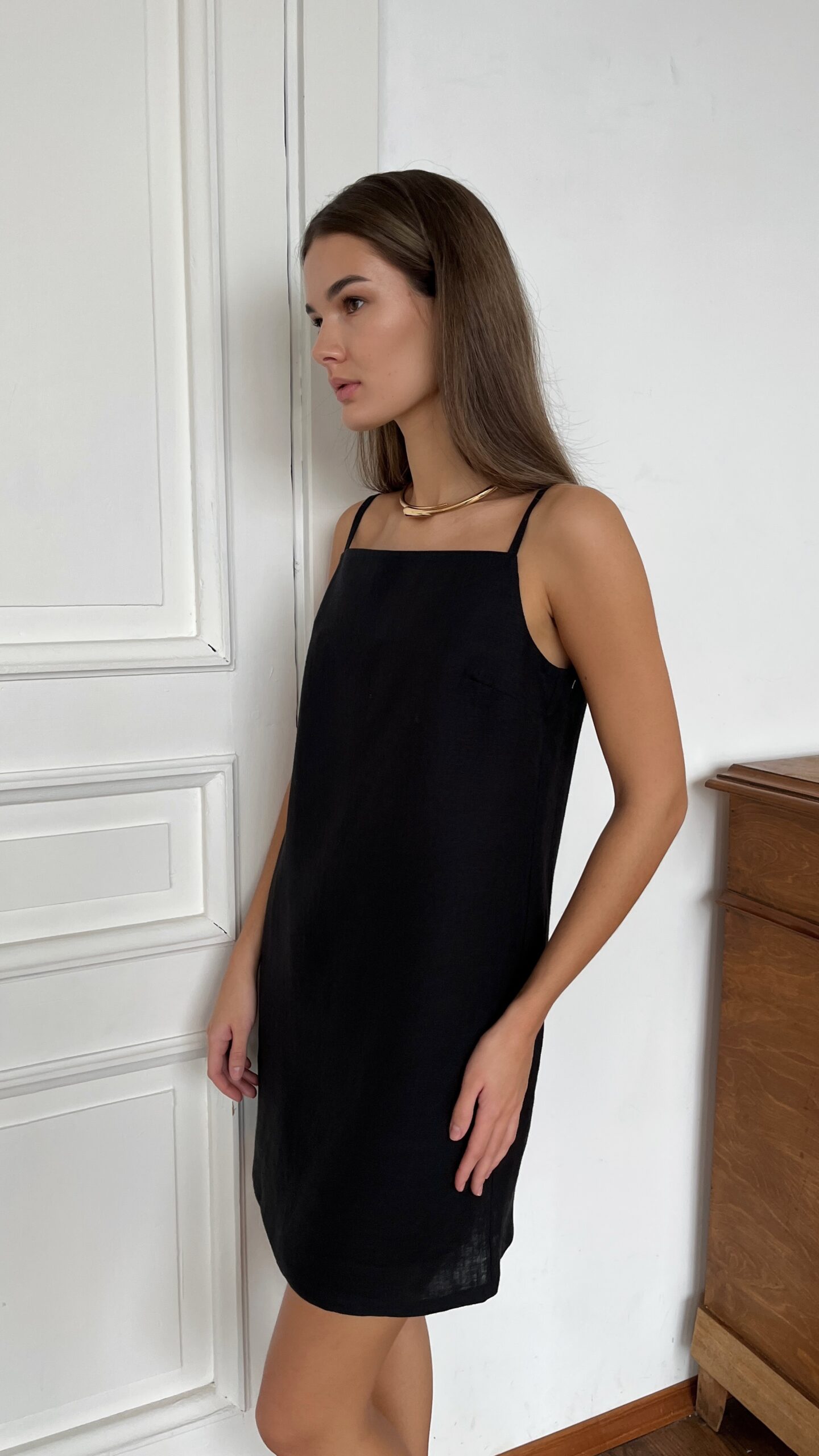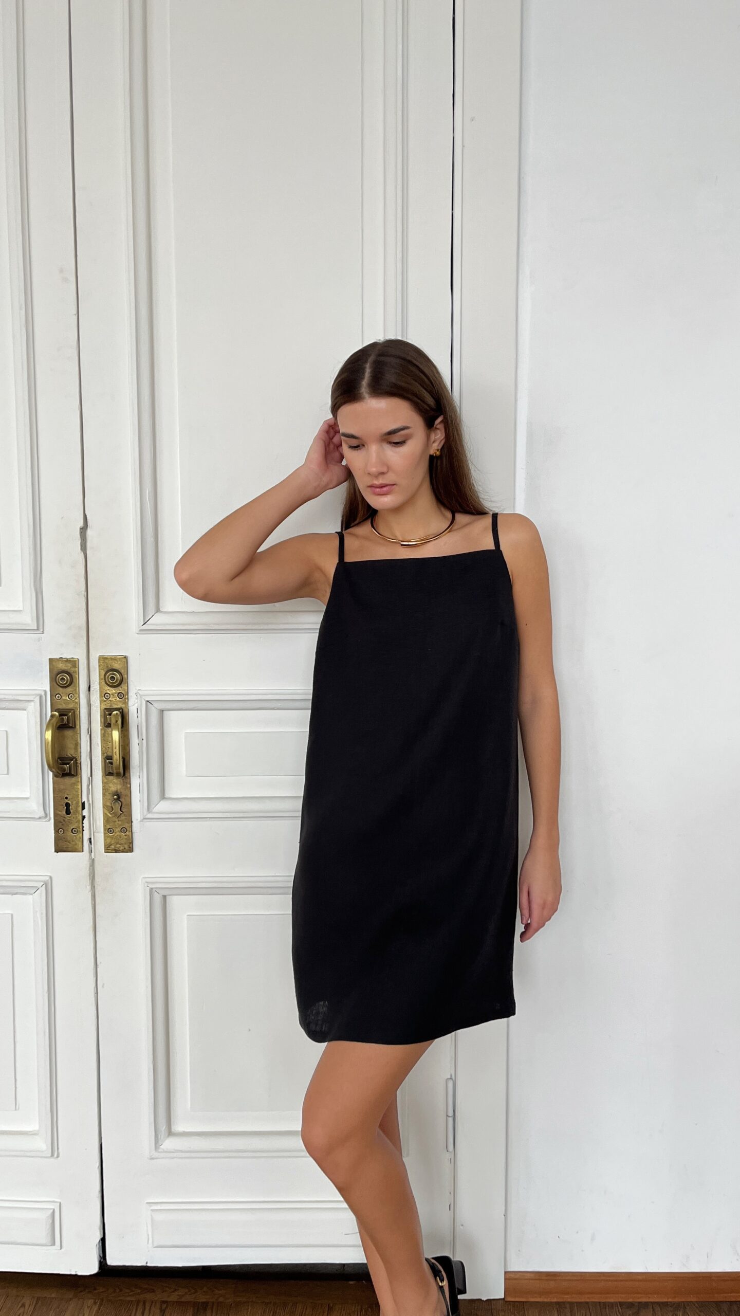 Летнее льняное платье свободного кроя в длине мини черного цвета.