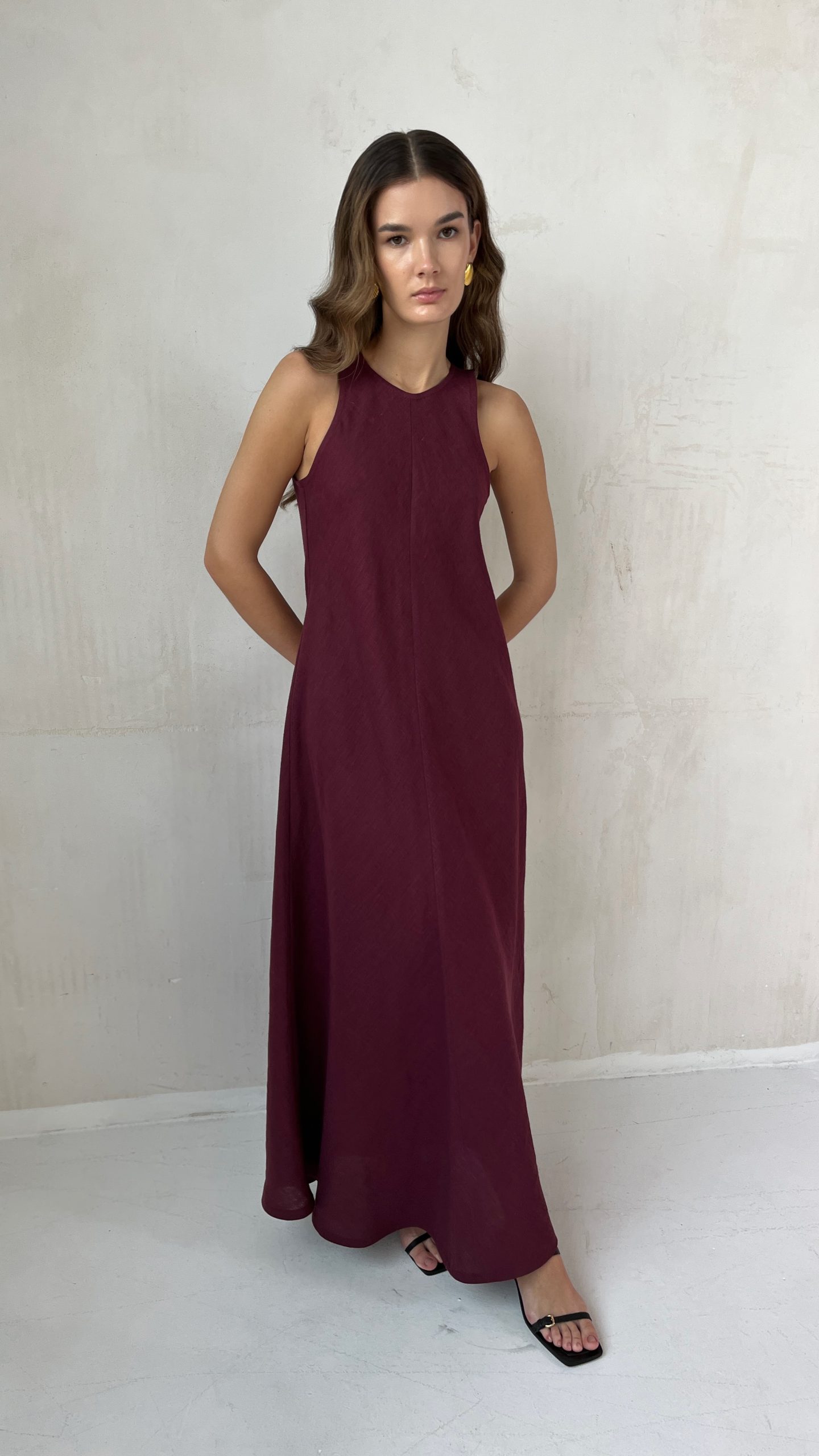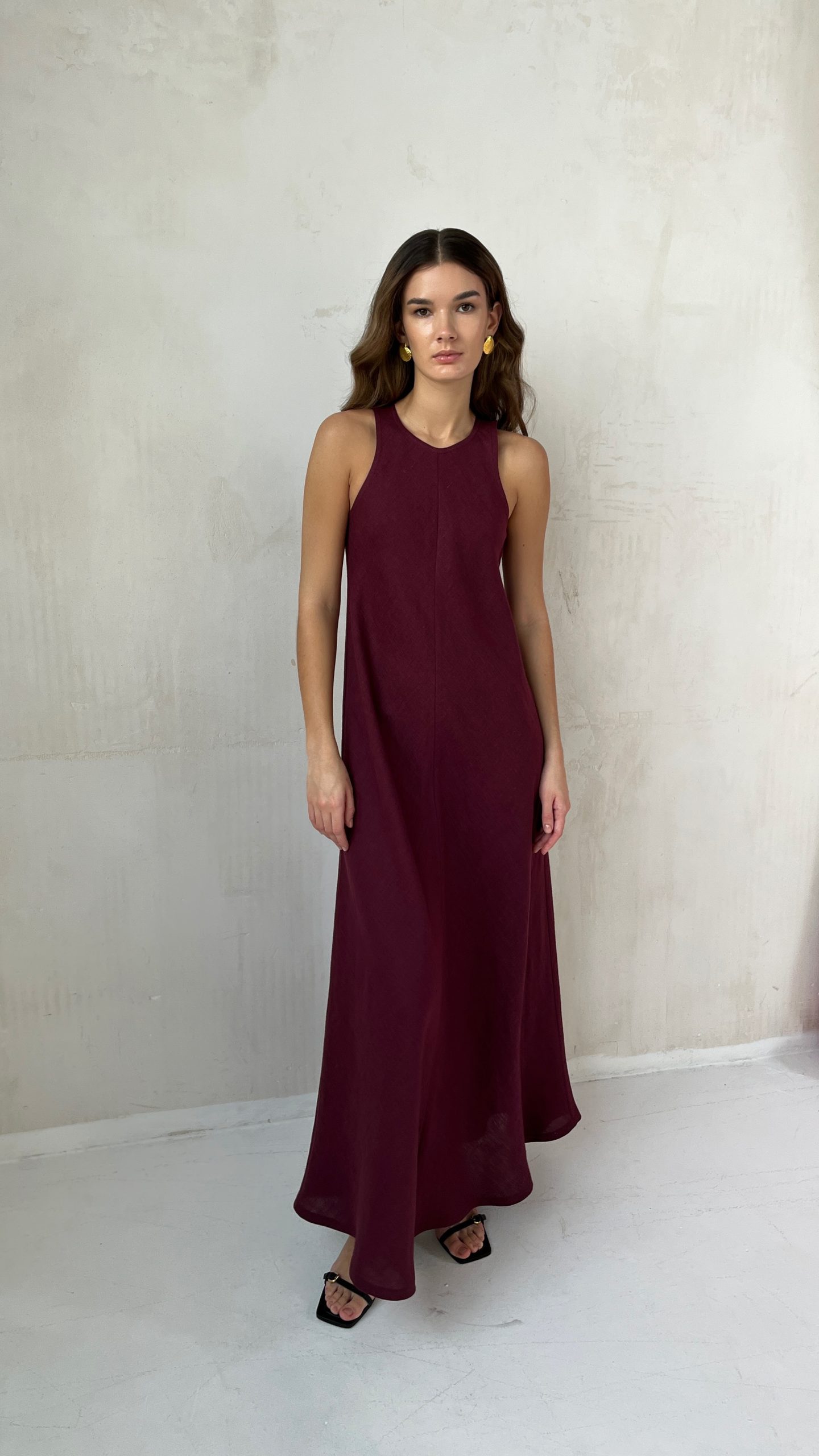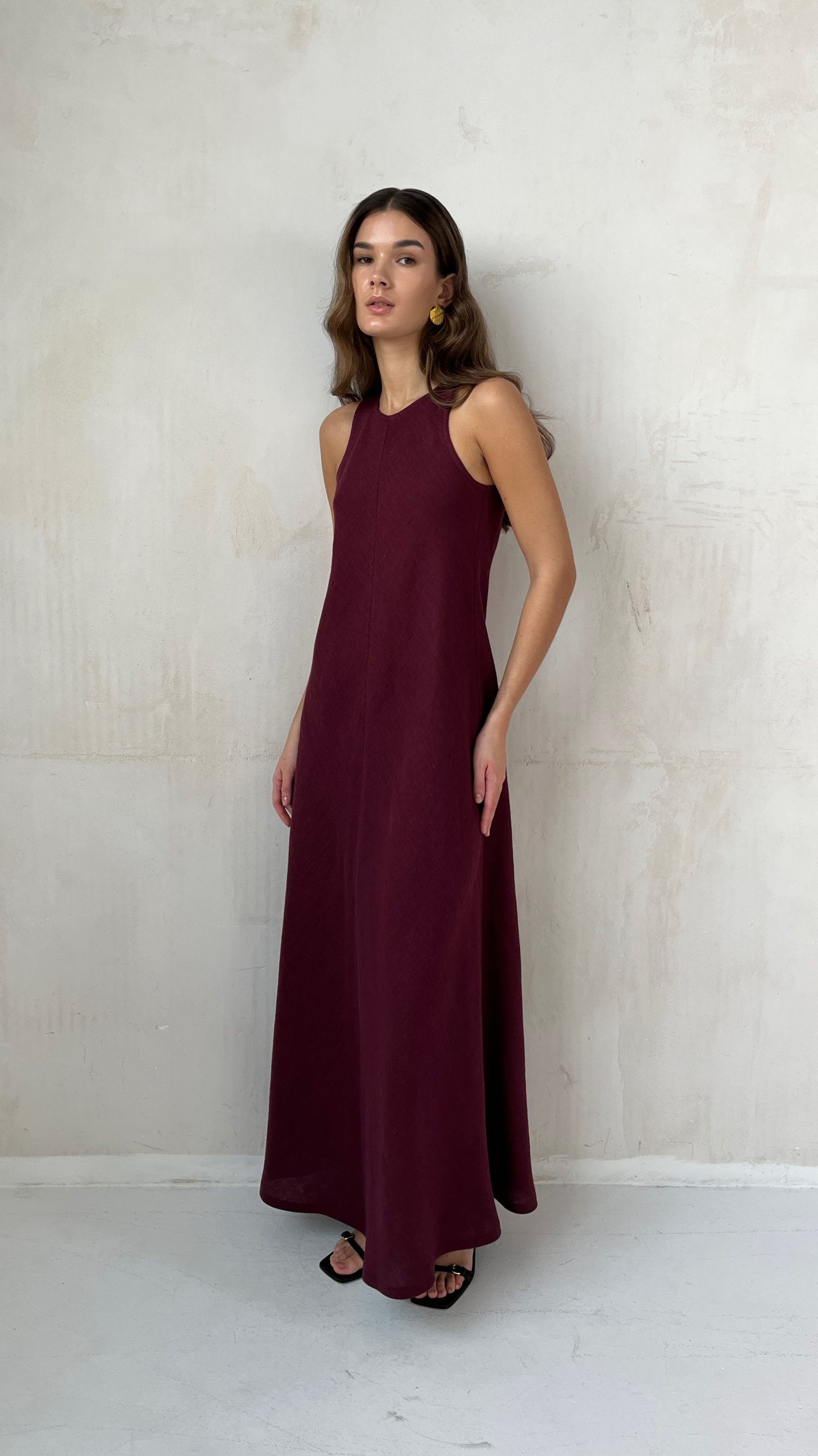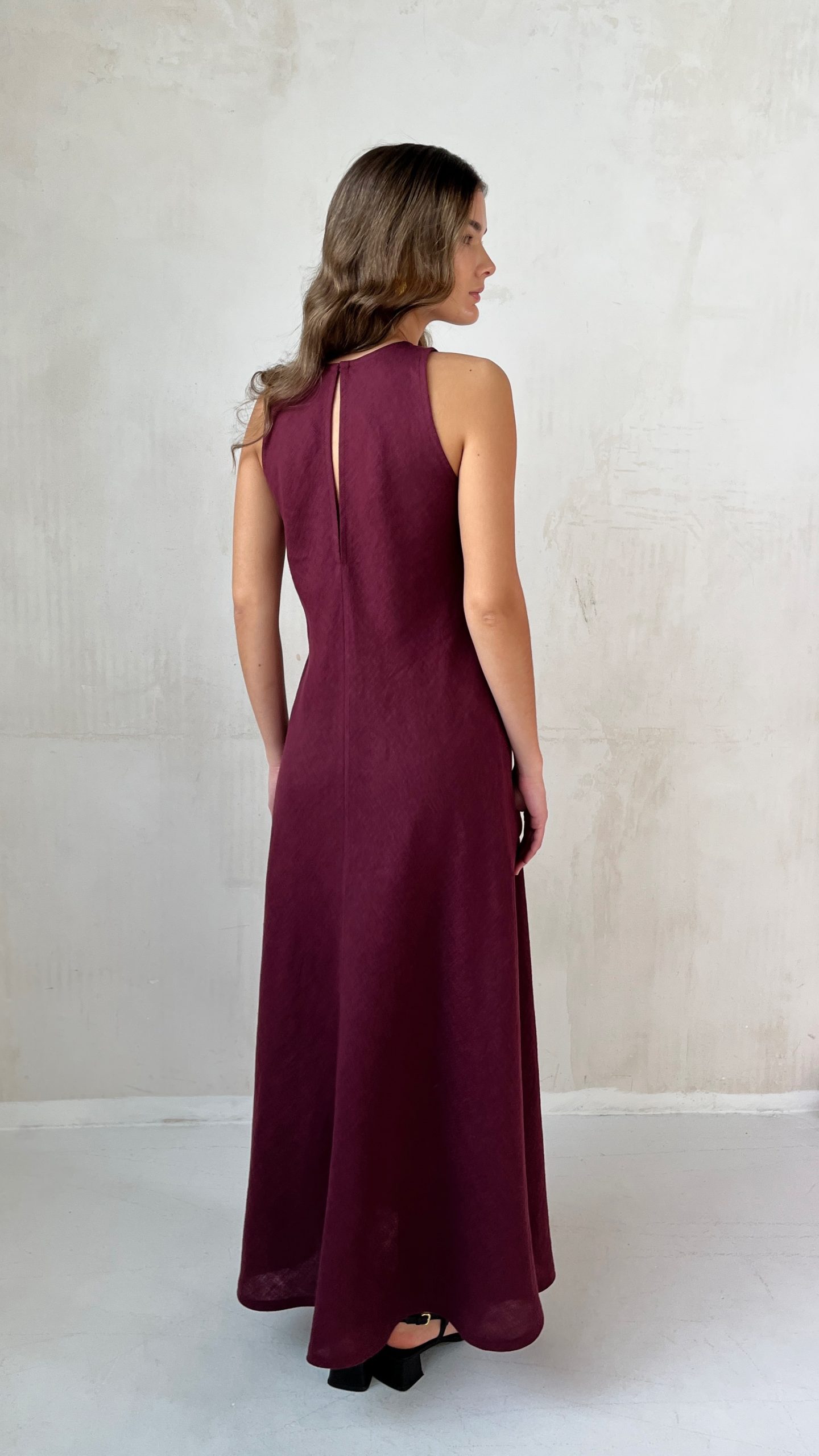 Летнее льняное платье по косой из мягкого 100% премиум льна в длине макси винного цвета.