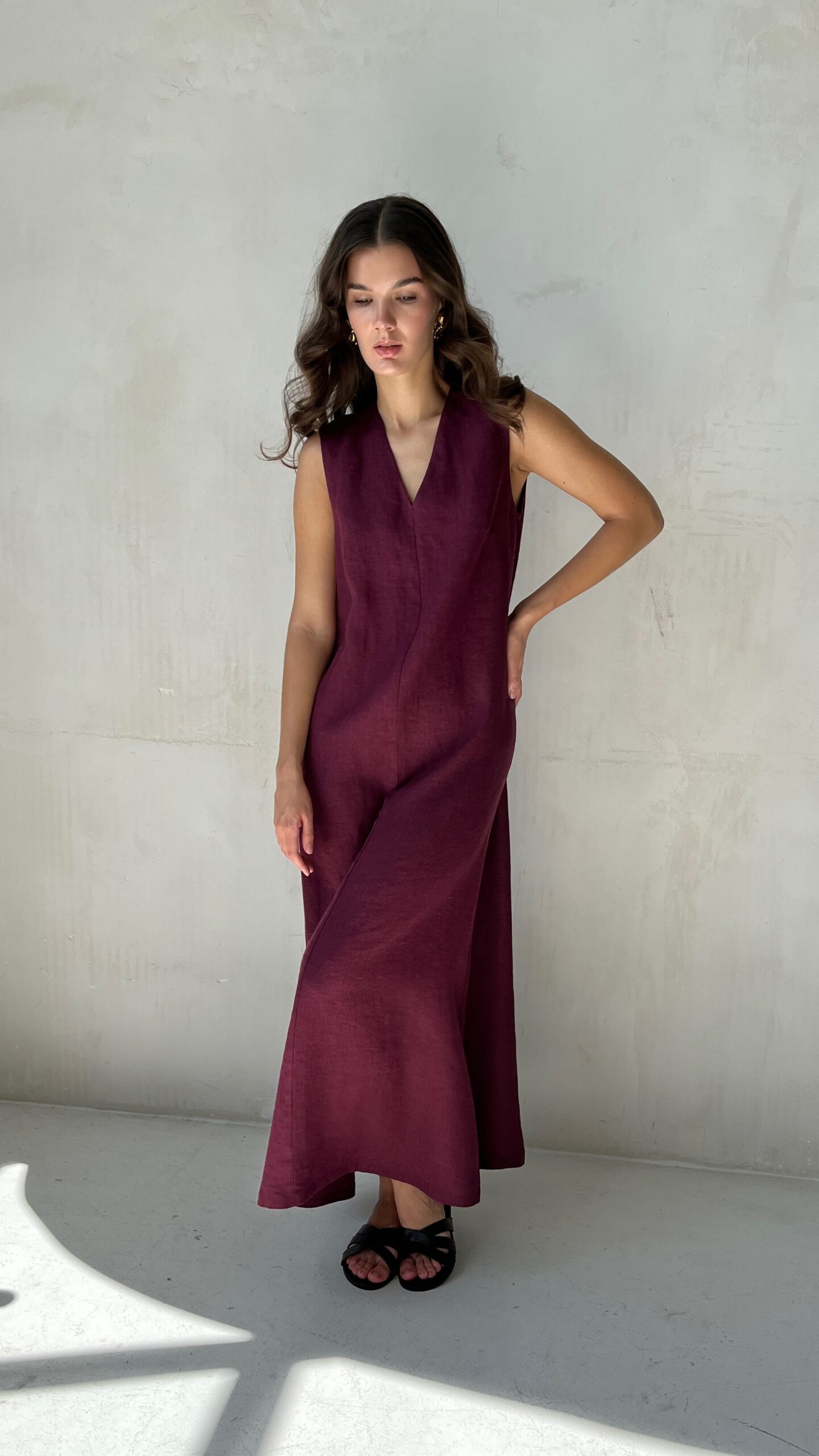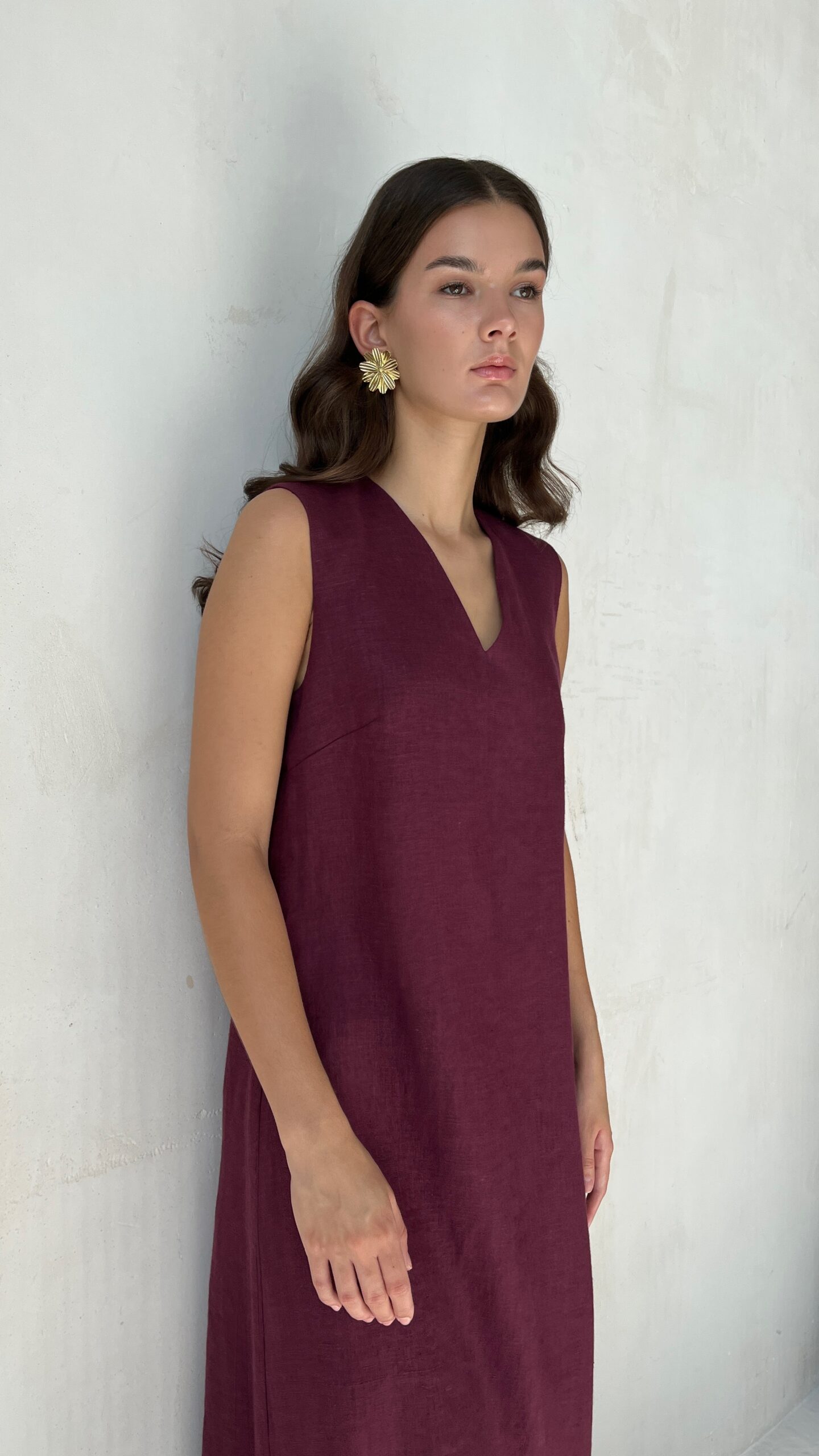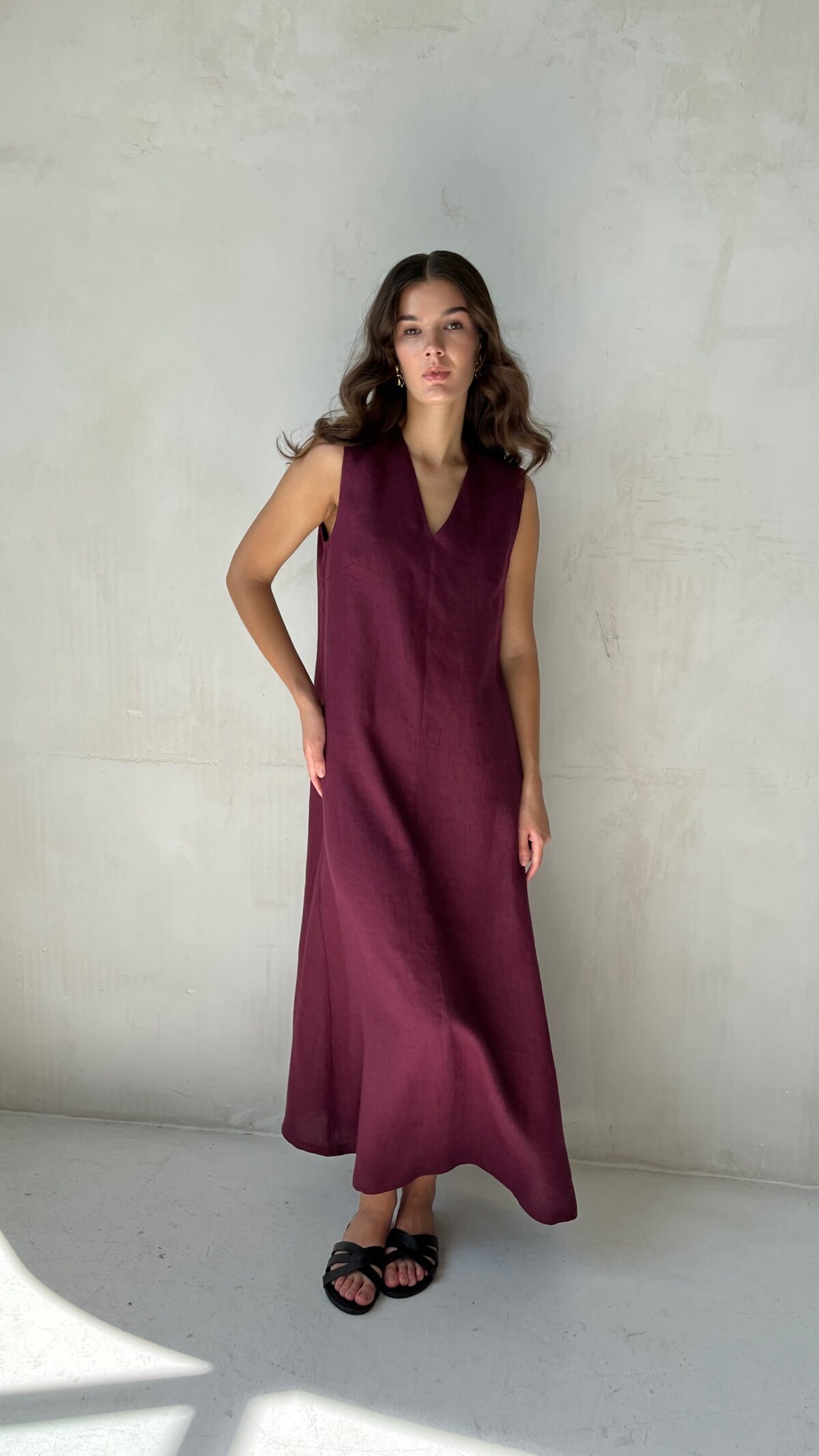 Платье-трапеция в благородном оттенке бургунди из умягченного льна. Длина миди подчеркивает женственность силуэта, а насыщенный винный цвет добавляет нотку роскоши и утонченности.