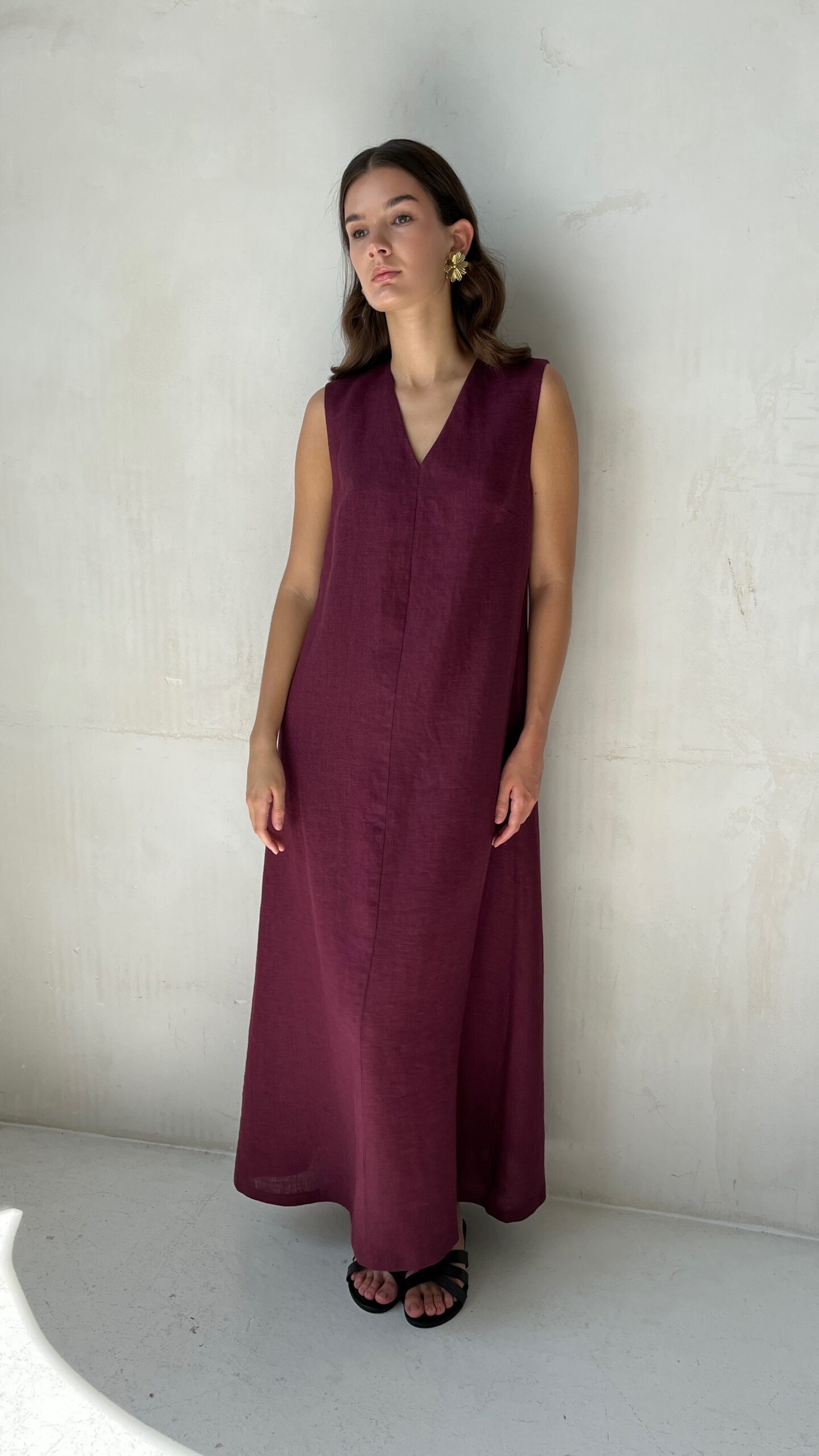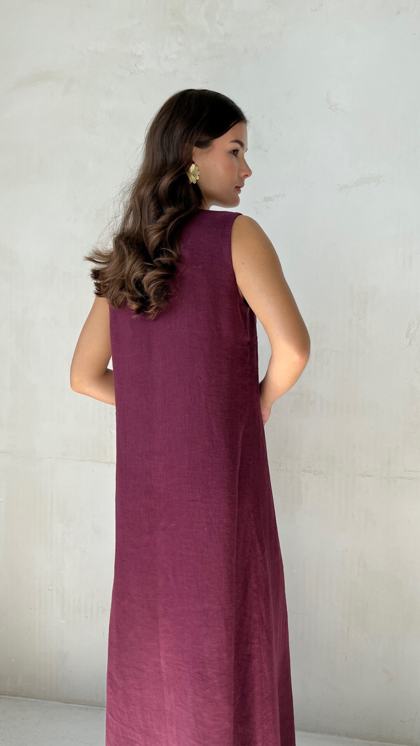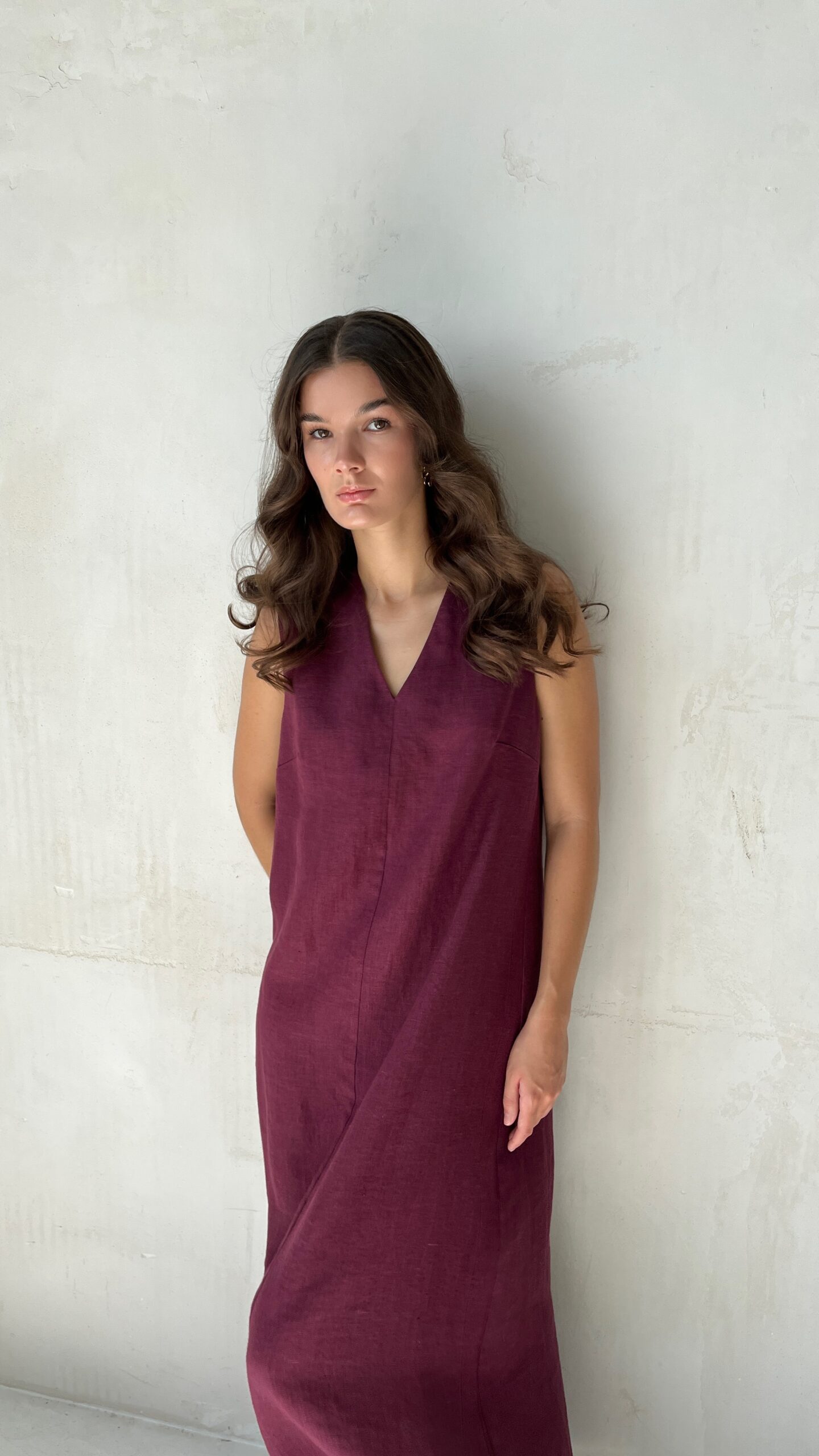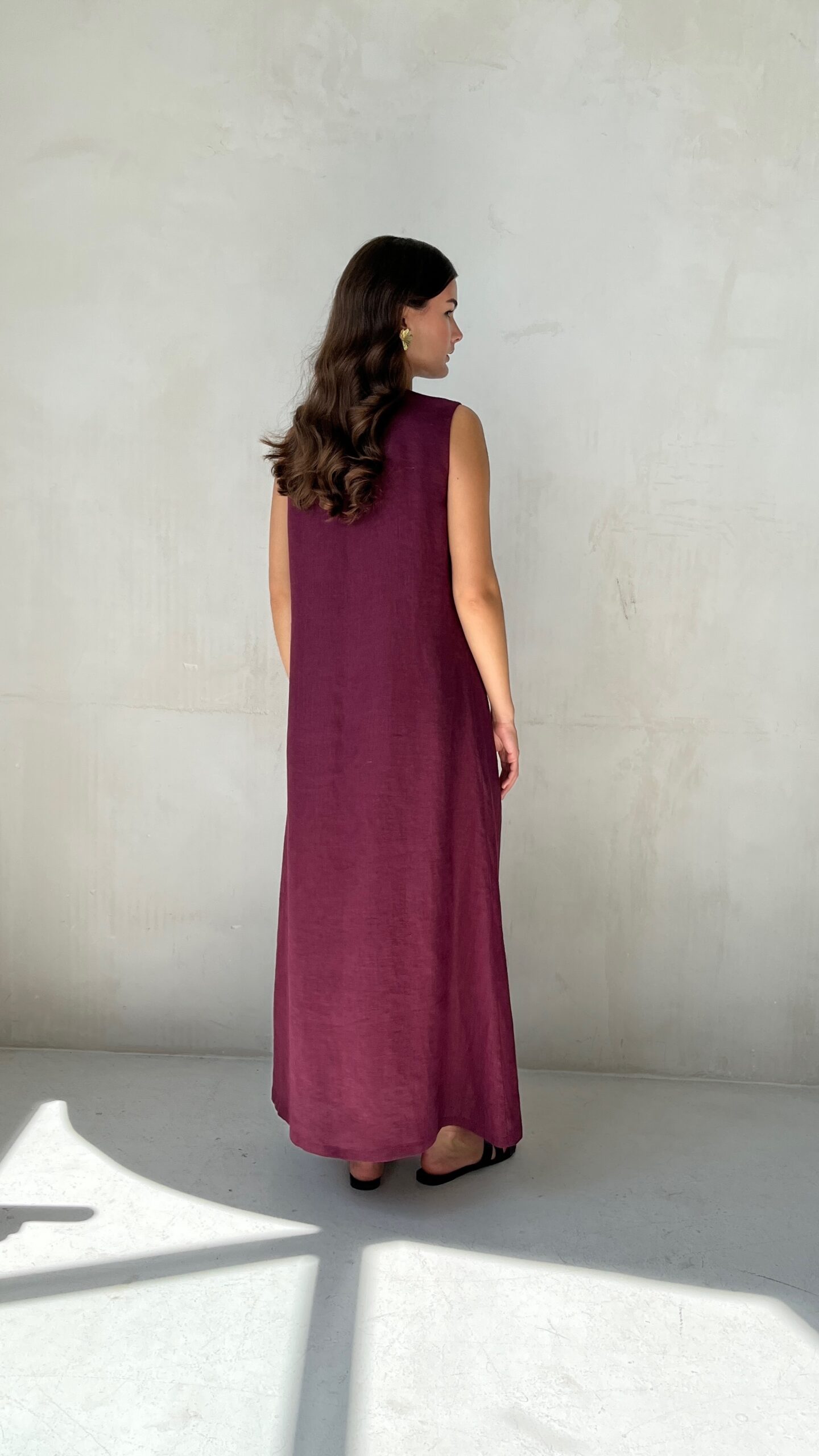 Платье-трапеция в благородном оттенке бургунди из умягченного льна. Длина миди подчеркивает женственность силуэта, а насыщенный винный цвет добавляет нотку роскоши и утонченности.