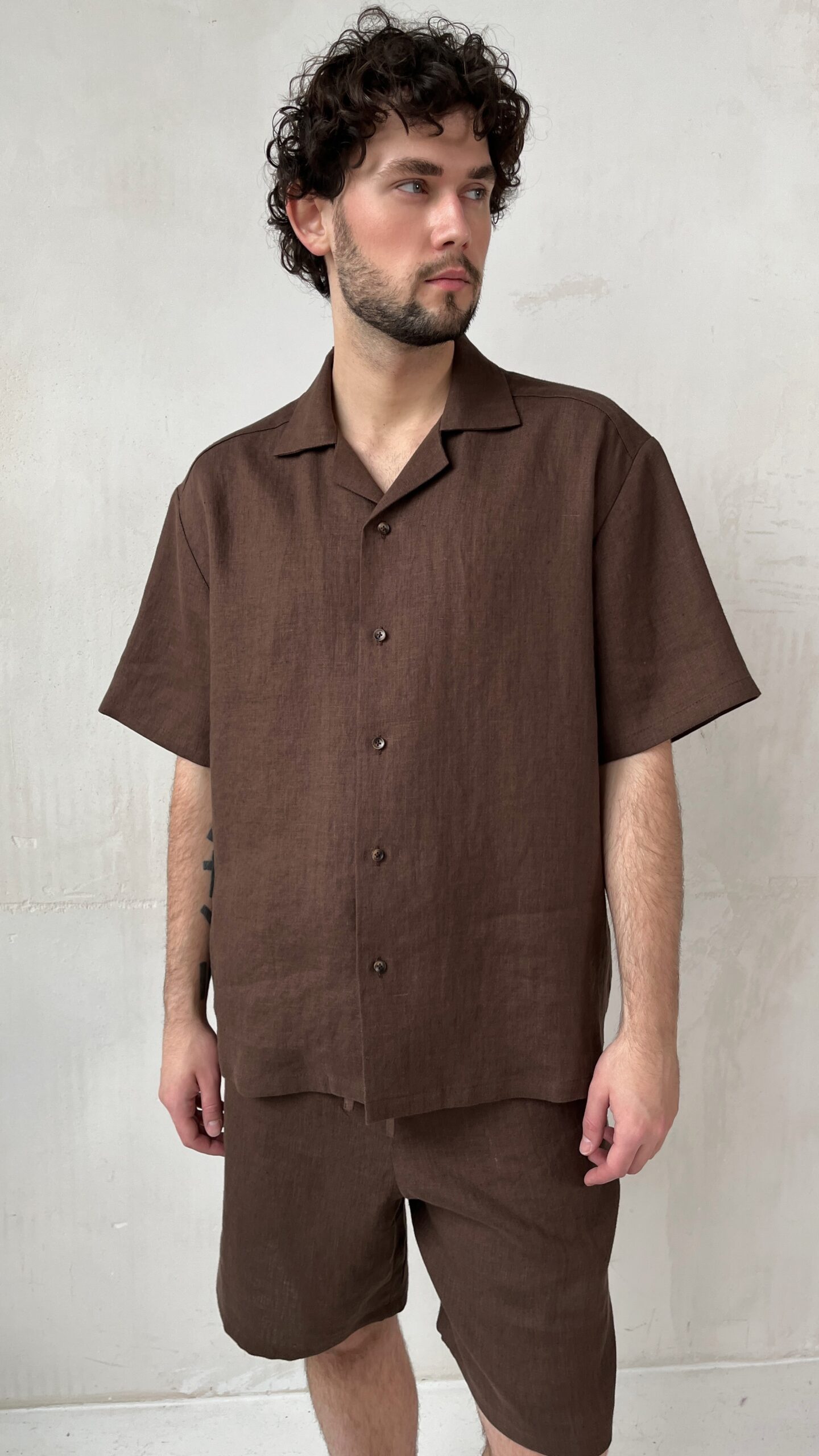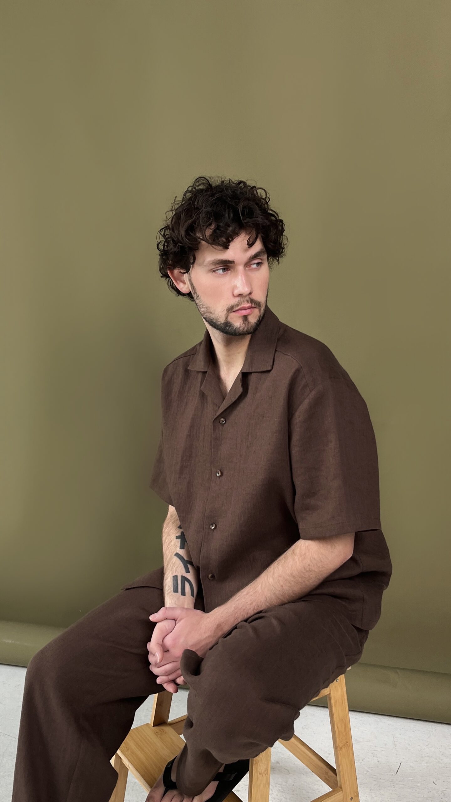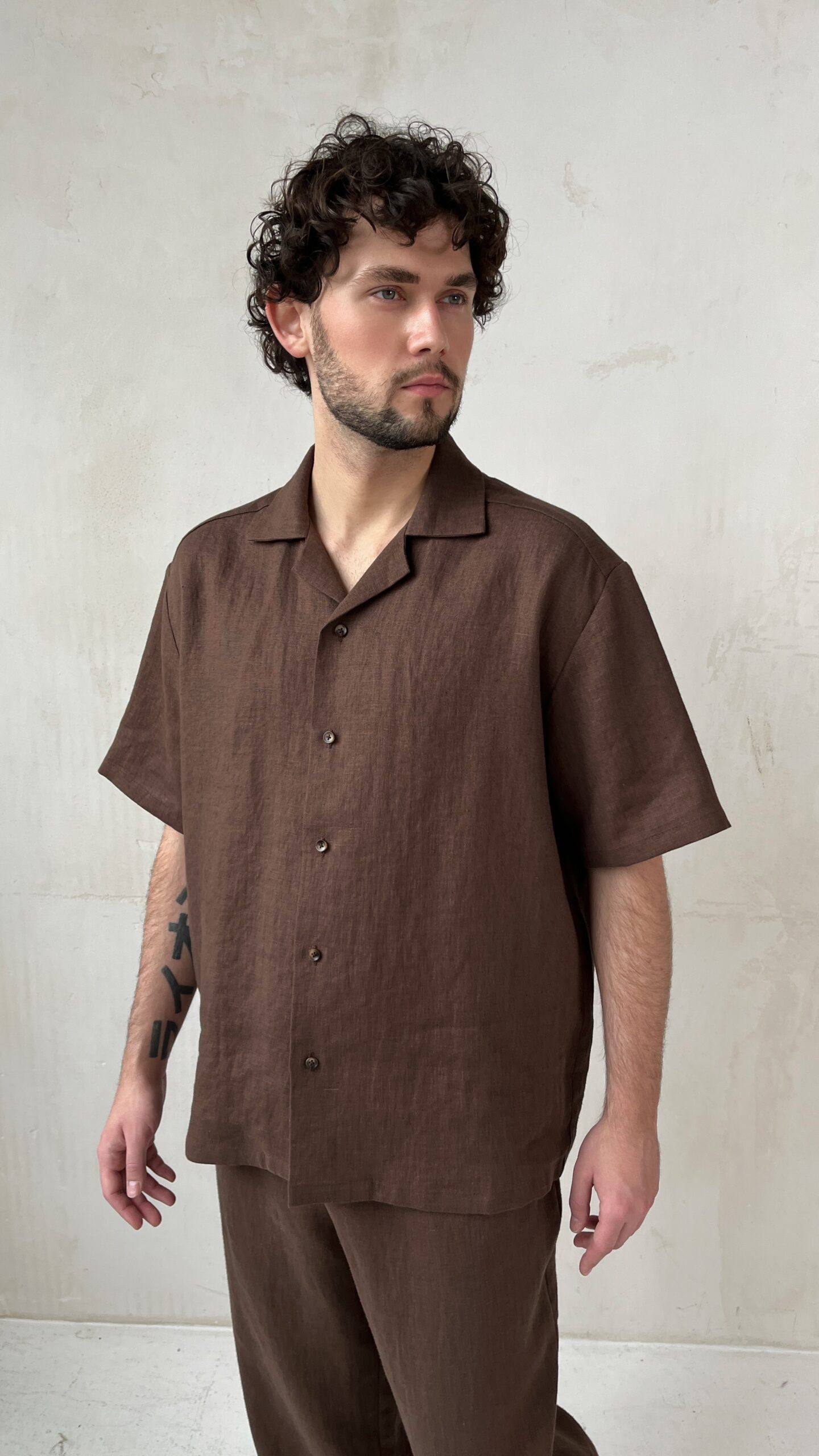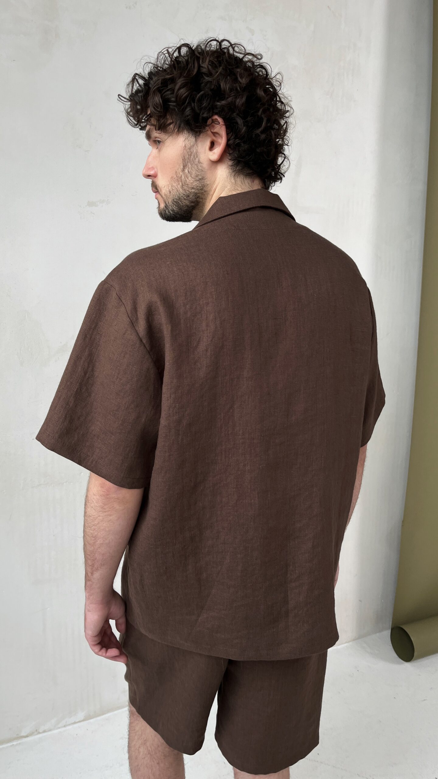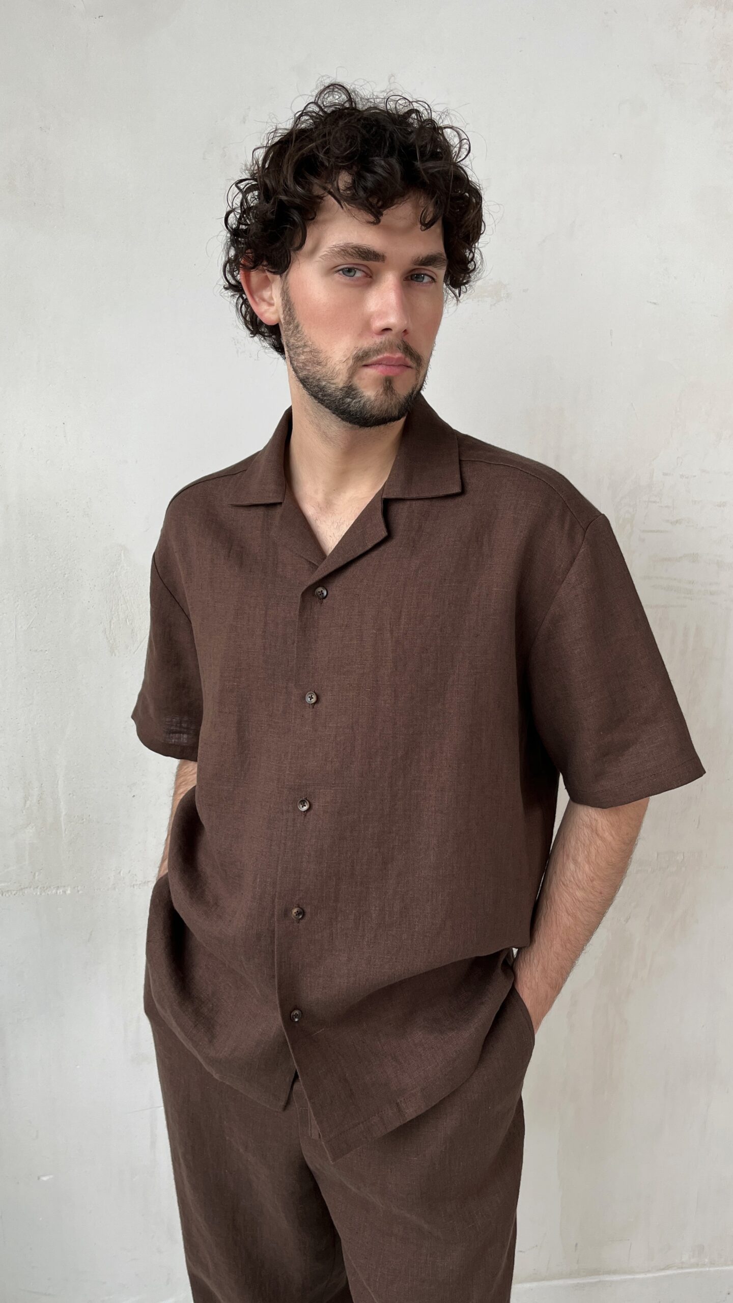 Мужская рубашка с коротким рукавом из 100% премиального льна коричневого цвета.