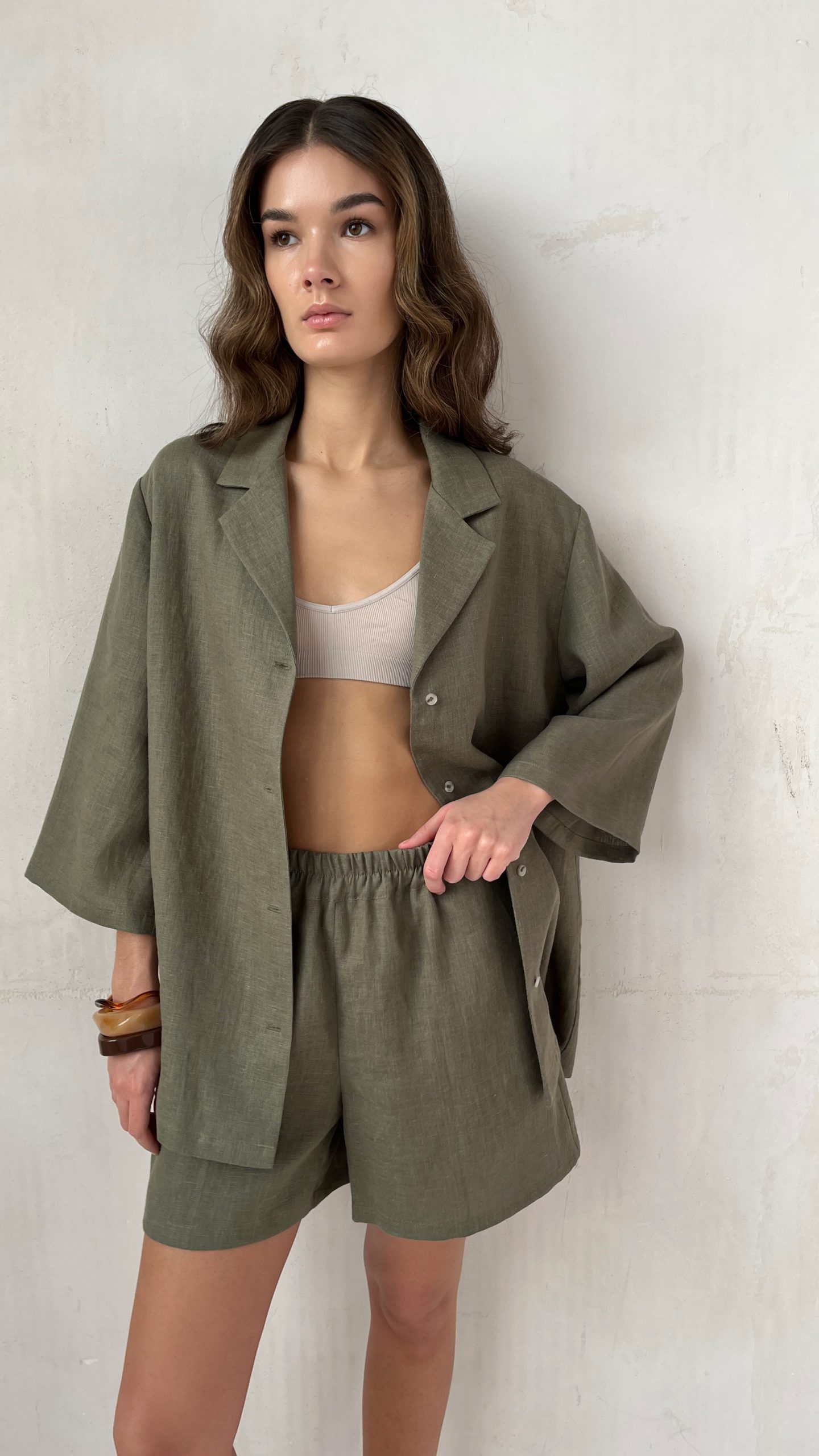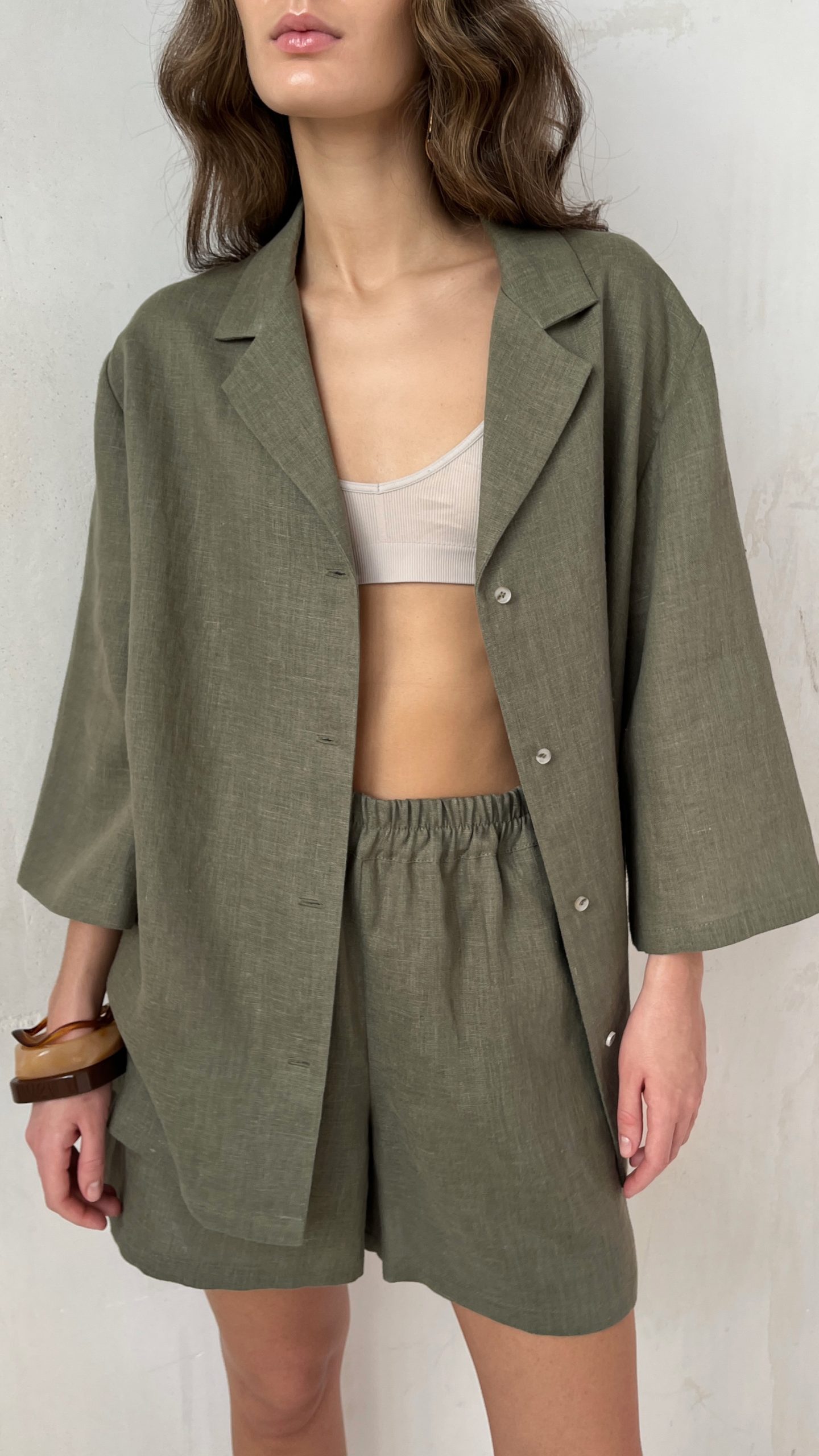 Шорты из льна прямого кроя. Широкий эластичный пояс по талии и боковые карманы. Изготовлены из натурального умягченного льна с crush эффектом. Для комплекта можно выбрать рубашку в тон с рукавом 3\4.