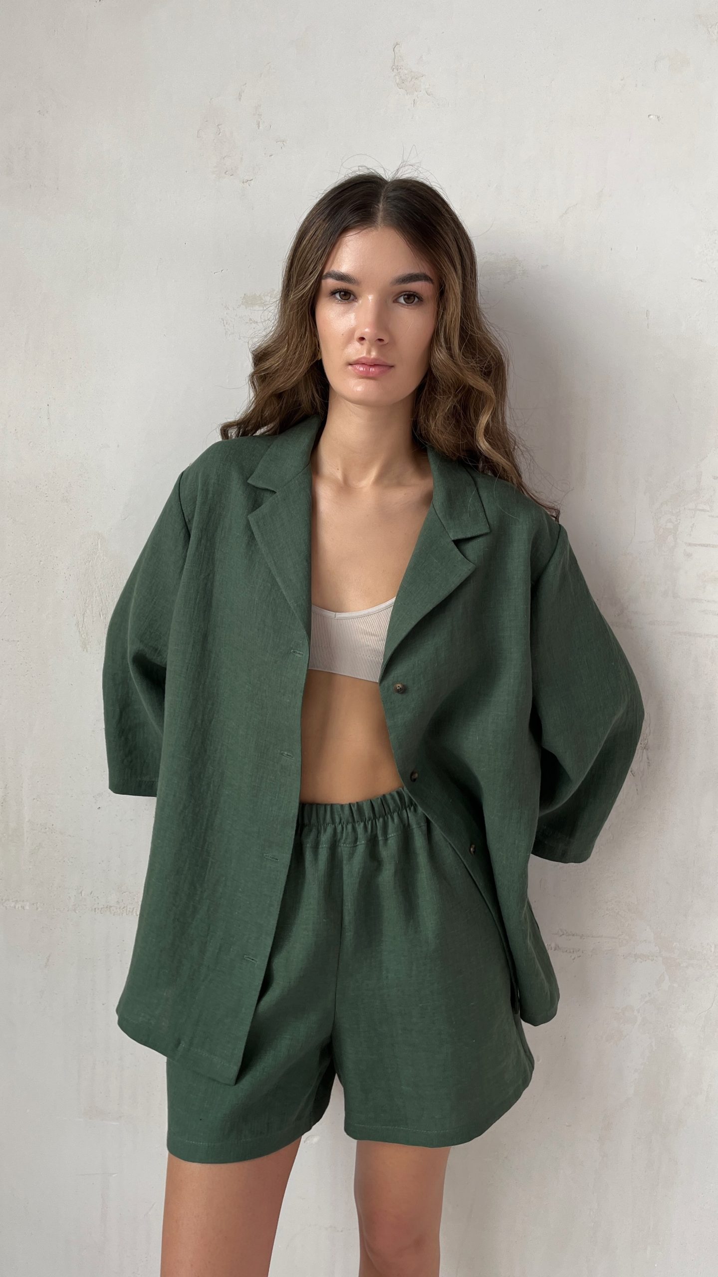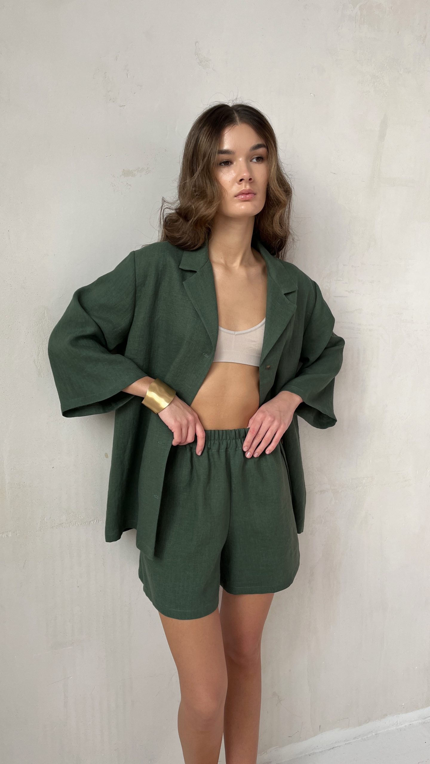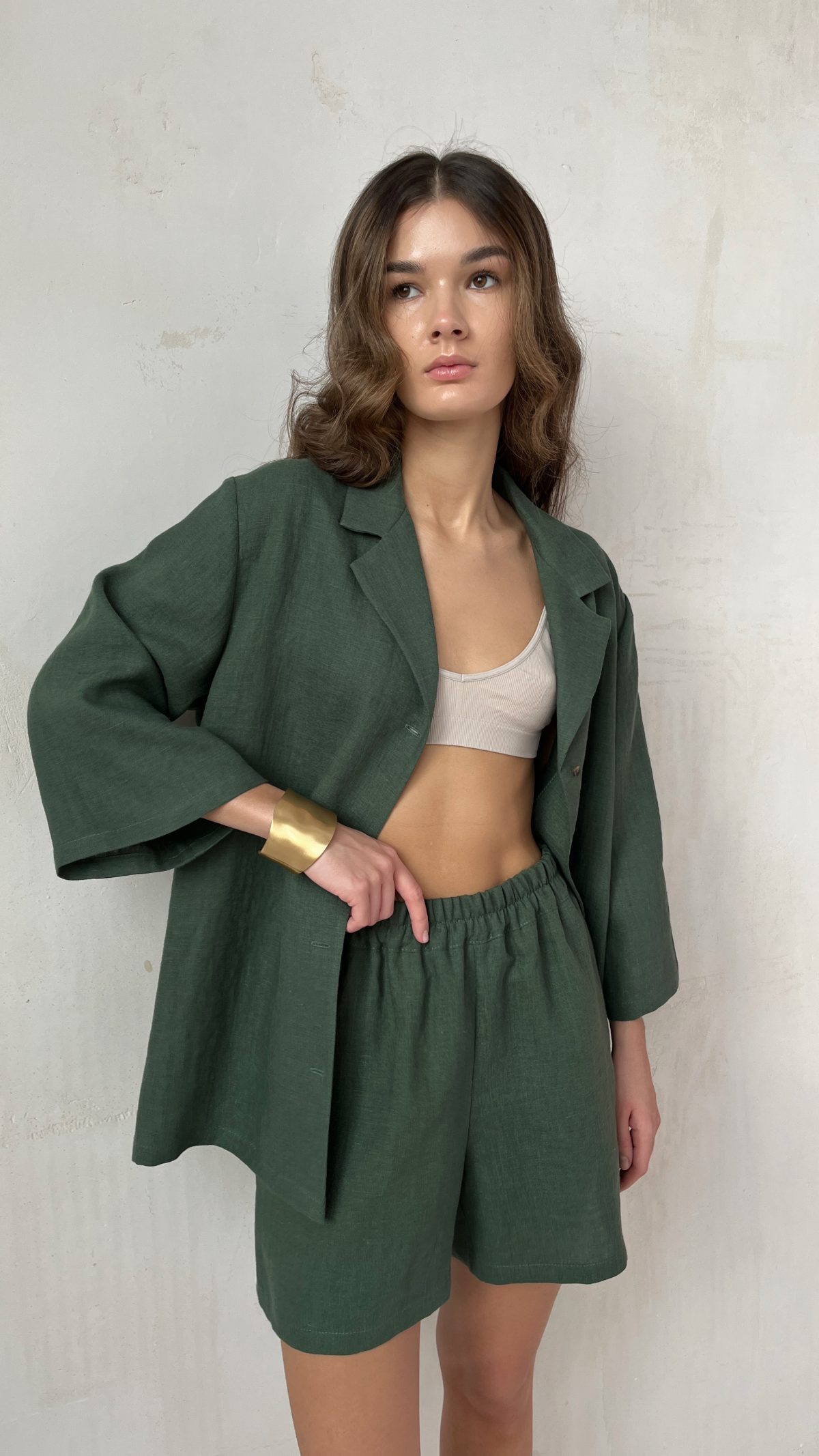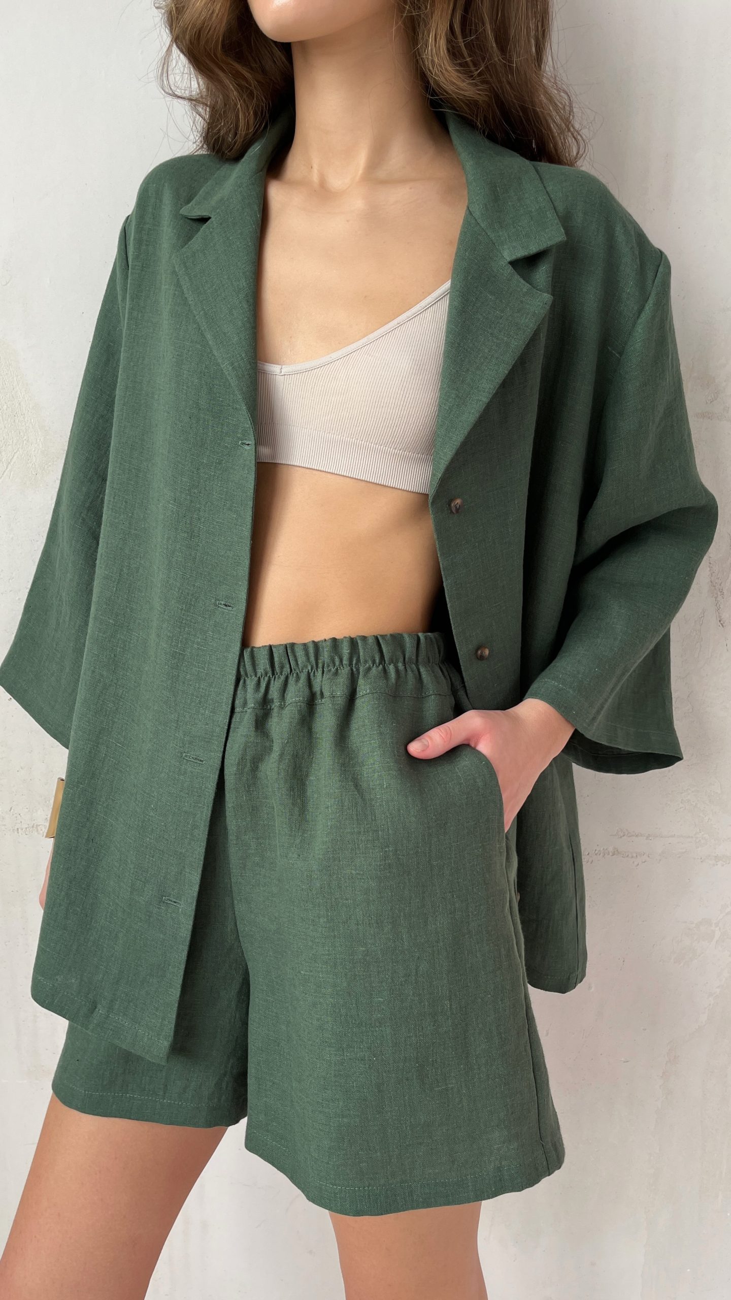 Шорты зеленые женские прямого кроя. Широкий эластичный пояс по талии и боковые карманы. Изготовлены из натурального умягченного льна с crush эффектом. Для комплекта можно выбрать рубашку в тон с рукавом 3\4.
