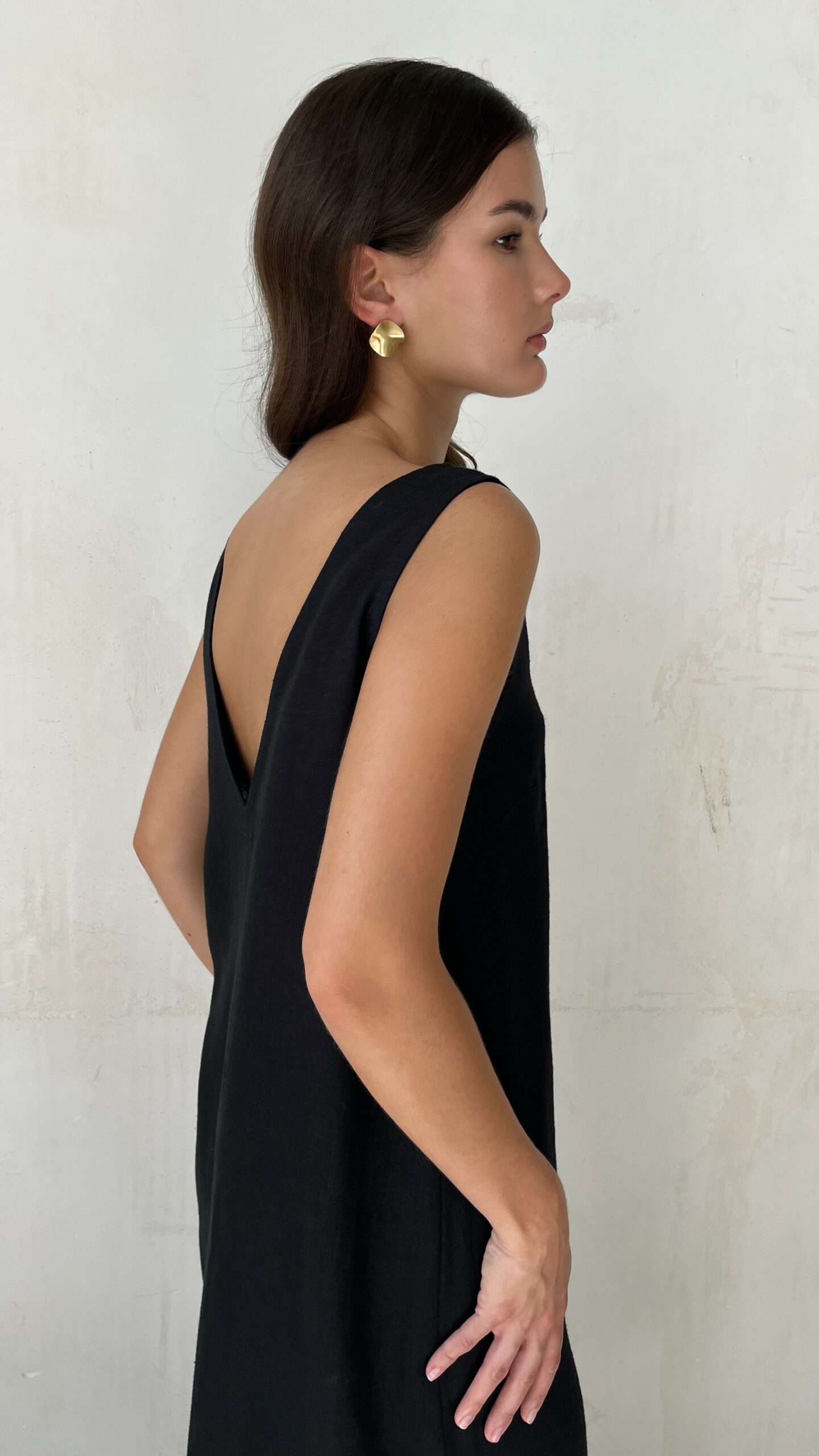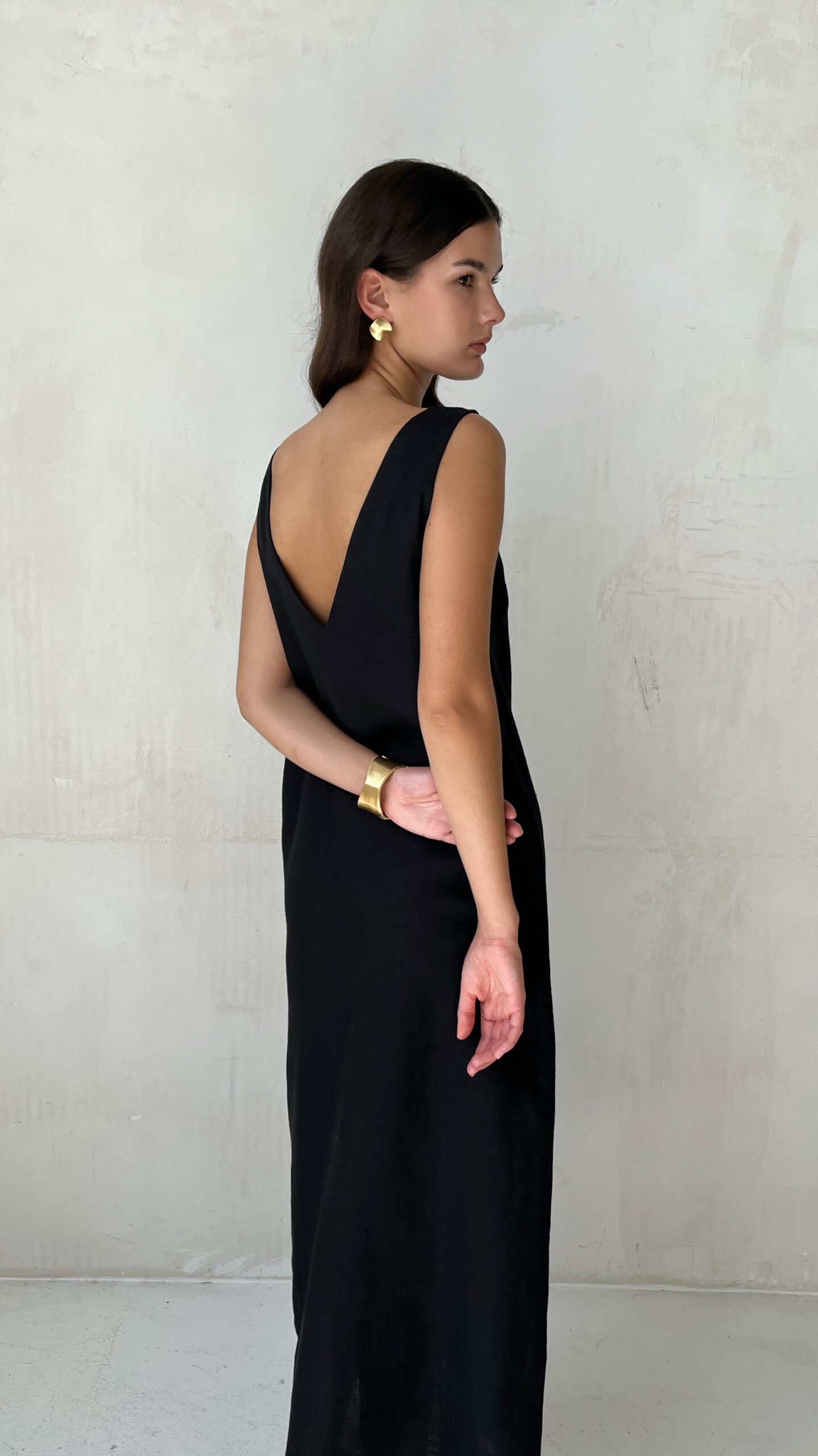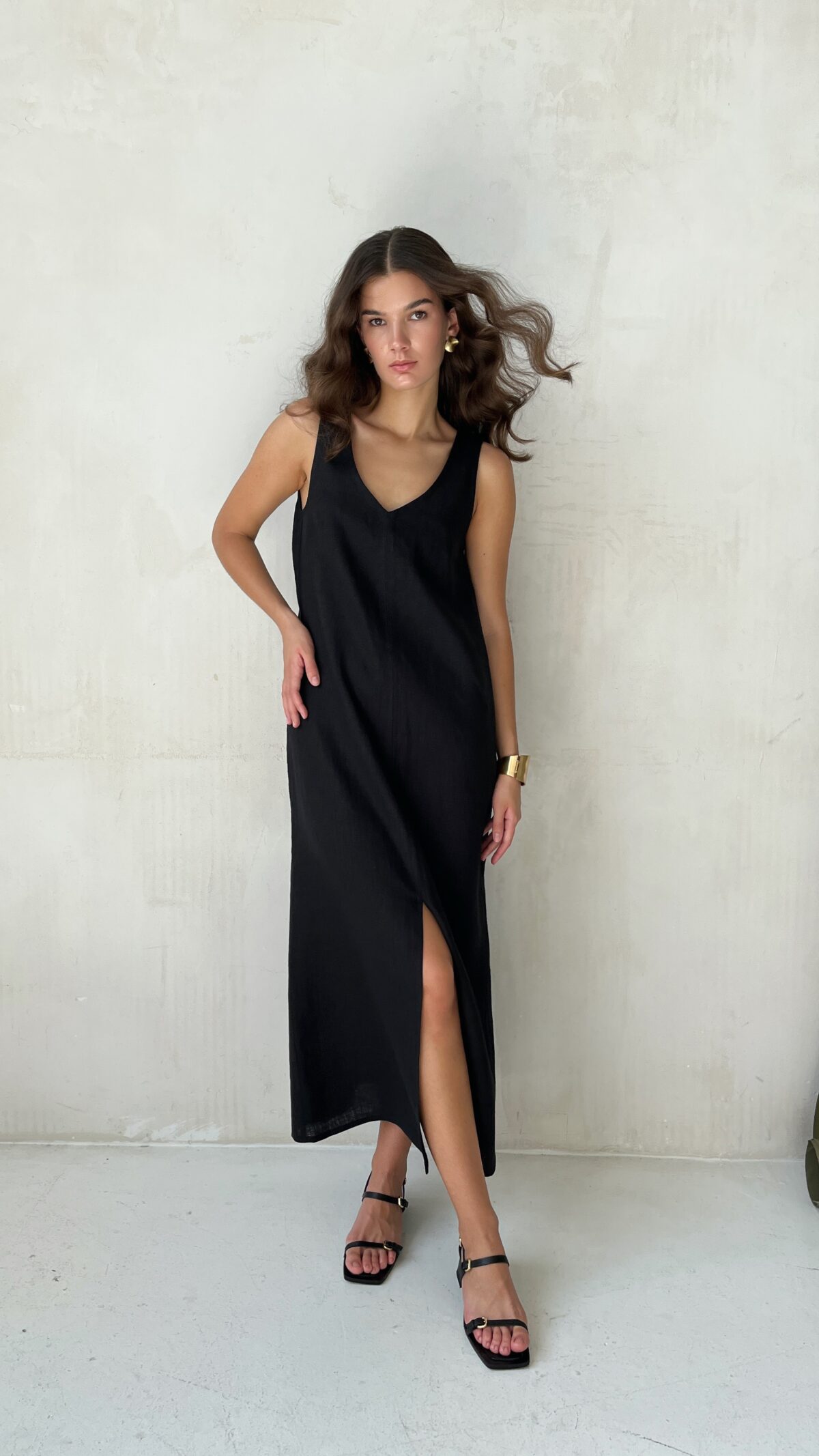 Платье из льна черное свободного кроя с глубоким разрезом спереди. v-образный вырез на груди и глубокий соблазнительный вырез по спинке. Платье изготовлено из костюмного, белорусского умягченного 100% льна с эффектом помятости — креш.