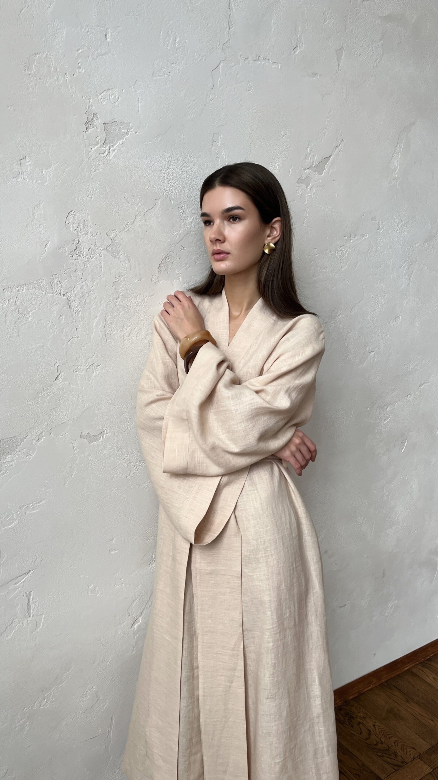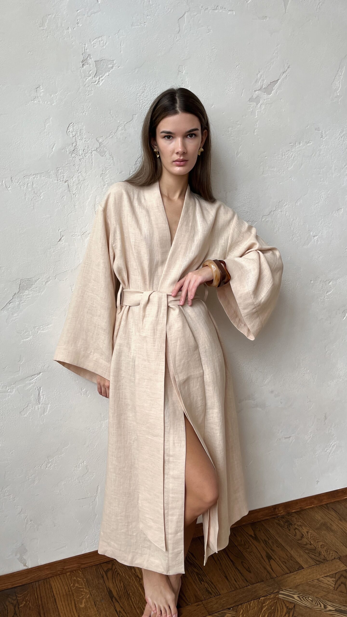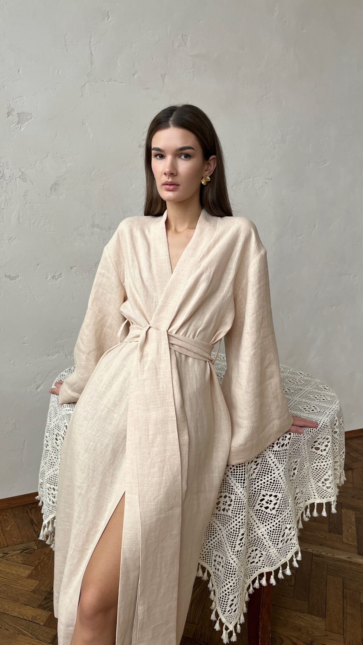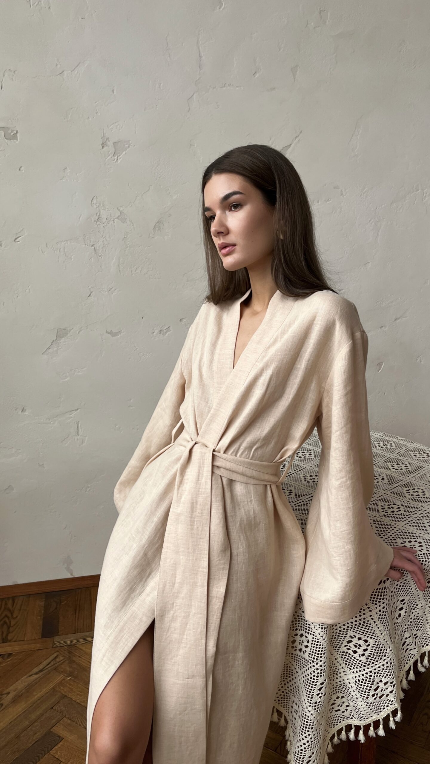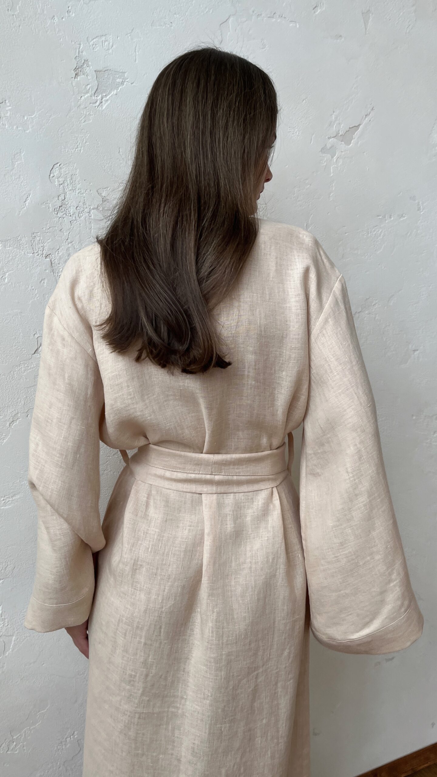 Женский халат-кимоно из льна с деликатной умягченной текстурой. Свободный крой и спущенная линия плеча создают расслабленный силуэт, подчеркивающий естественную красоту натуральной ткани.