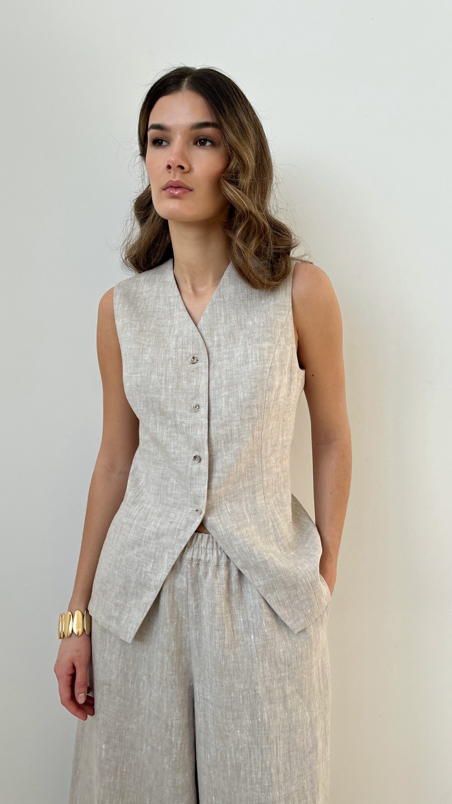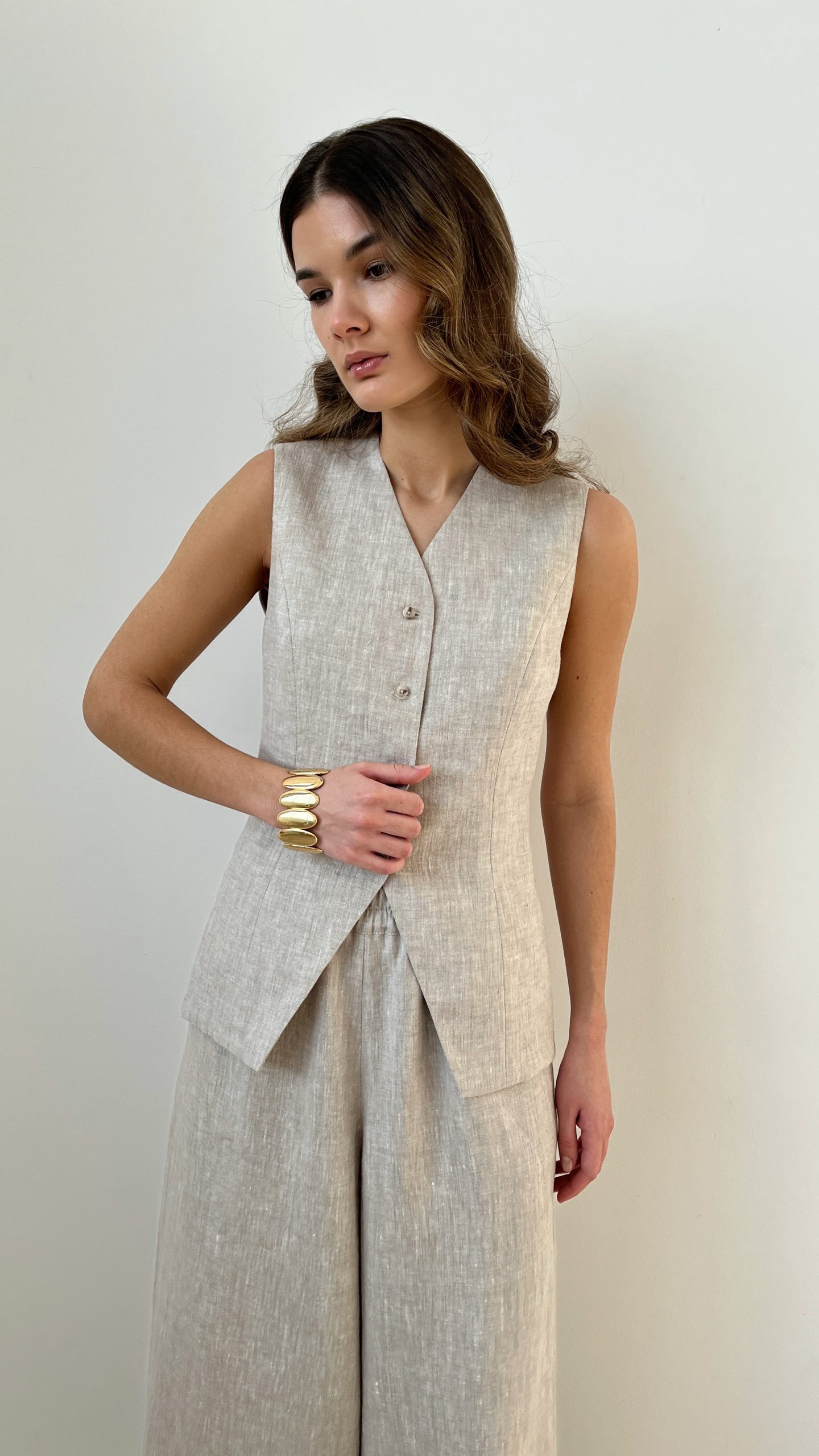 Удлиненный женский жилет из умягченного 100% льна в натуральном оттенке. Однобортный жилет приталенного кроя на подкладе из основной ткани. Застегивается на пуговицы.
